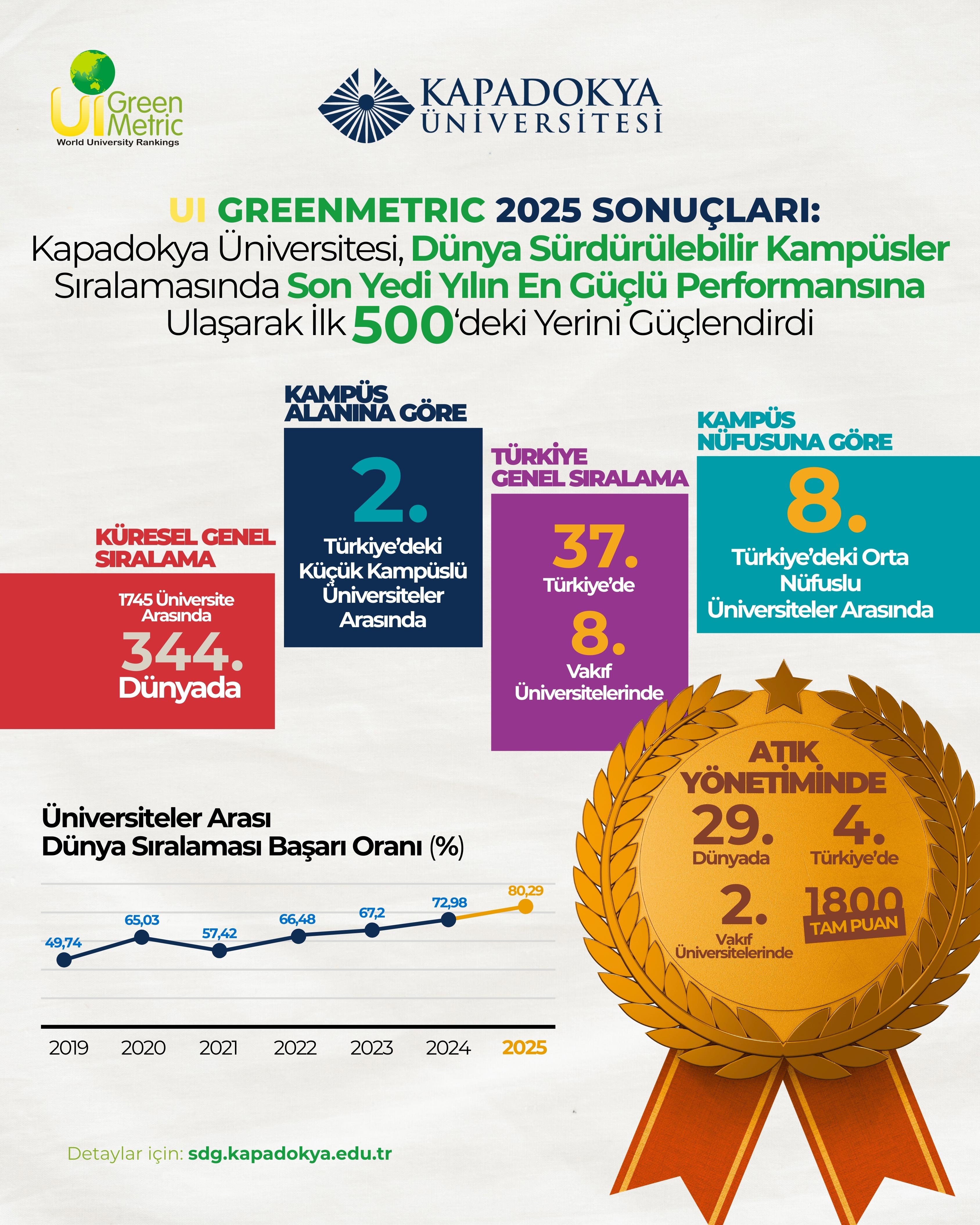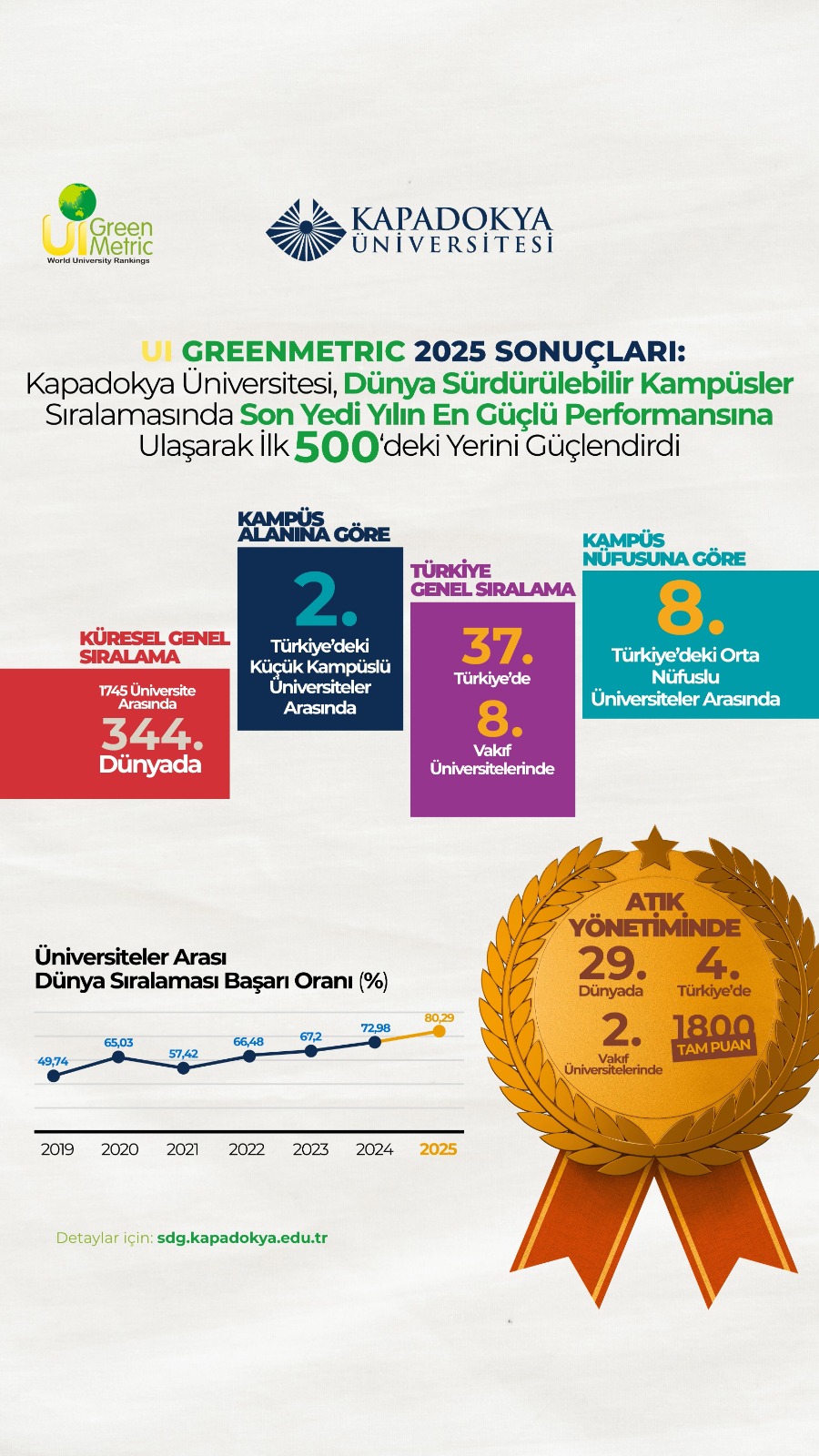 Kapadokya Üniversitesi (KÜN), 2025 yılında dünya genelinde 1745 üniversitenin değerlendirildiği UI GreenMetric Dünya Üniversiteler Sıralaması sonuçlarına göre, genel sıralamada geçen seneki konumu olan 399. sıradan 344. sıraya yükselerek sürdürülebilir üniversiteler arasında ilk 500’deki konumunu güçlendirdi.