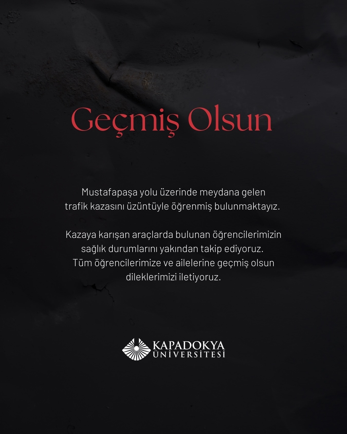 Kapadokya Üniversitesi, Ürgüp Mustafapaşa yolu üzerinde yaşanan trafik kazasını üzüntüyle öğrendiklerini açıkladı. Kazaya karışan araçlarda bulunan öğrencilerin sağlık durumlarının yakından takip edildiği belirtilen açıklamada, tüm öğrenciler ve ailelerine geçmiş olsun dilekleri iletildi.