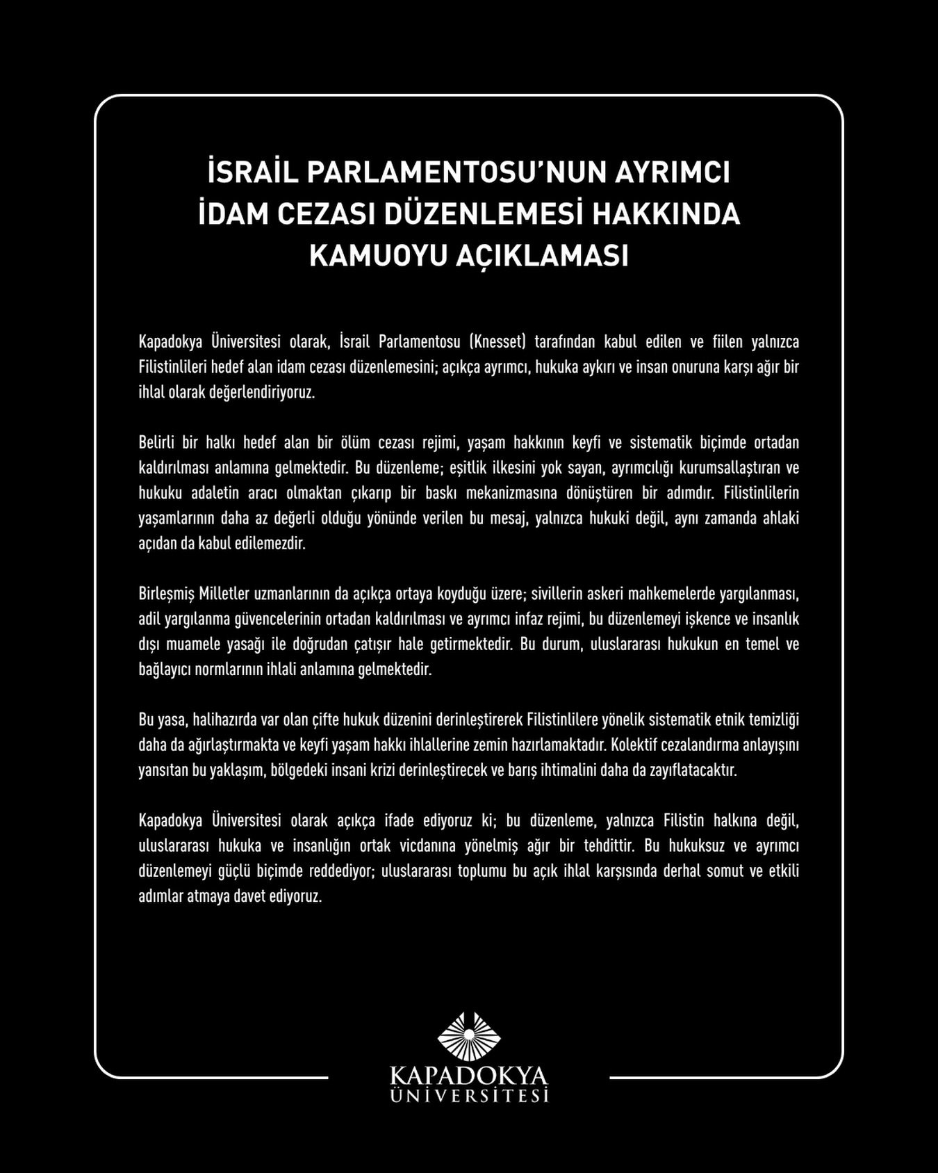 Kapadokya Üniversitesi, İsrail Parlamentosu tarafından kabul edilen ve Filistinlileri hedef aldığı belirtilen idam cezası düzenlemesine ilişkin kamuoyu açıklaması yayımladı. Üniversite, söz konusu düzenlemeyi “ayrımcı, hukuka aykırı ve insan onuruna açık bir ihlal” olarak değerlendirdi.