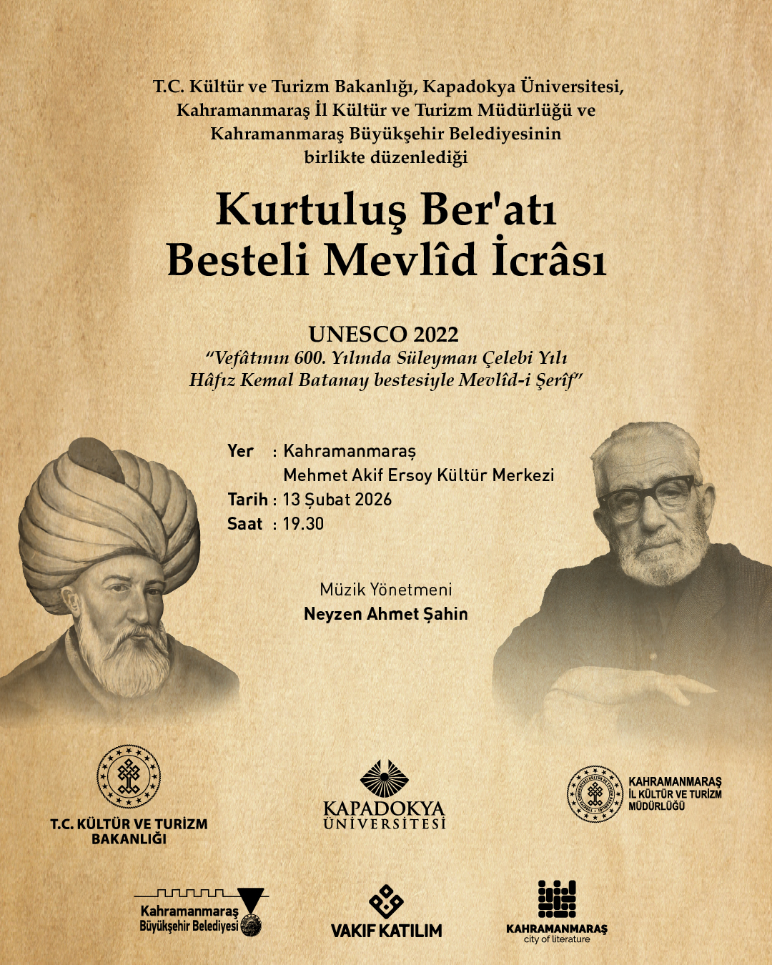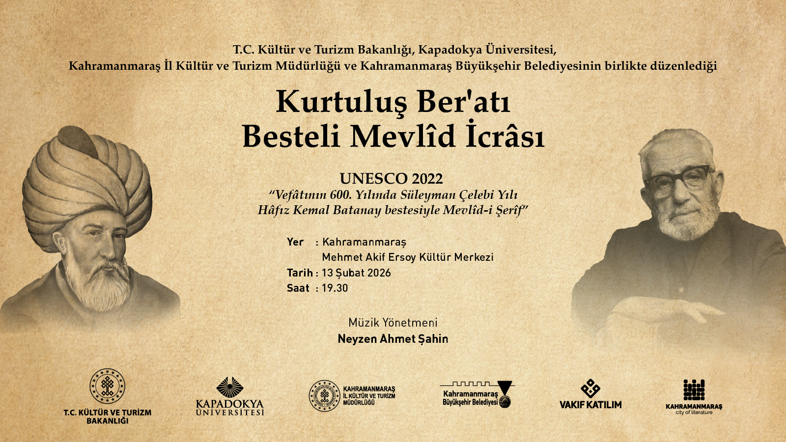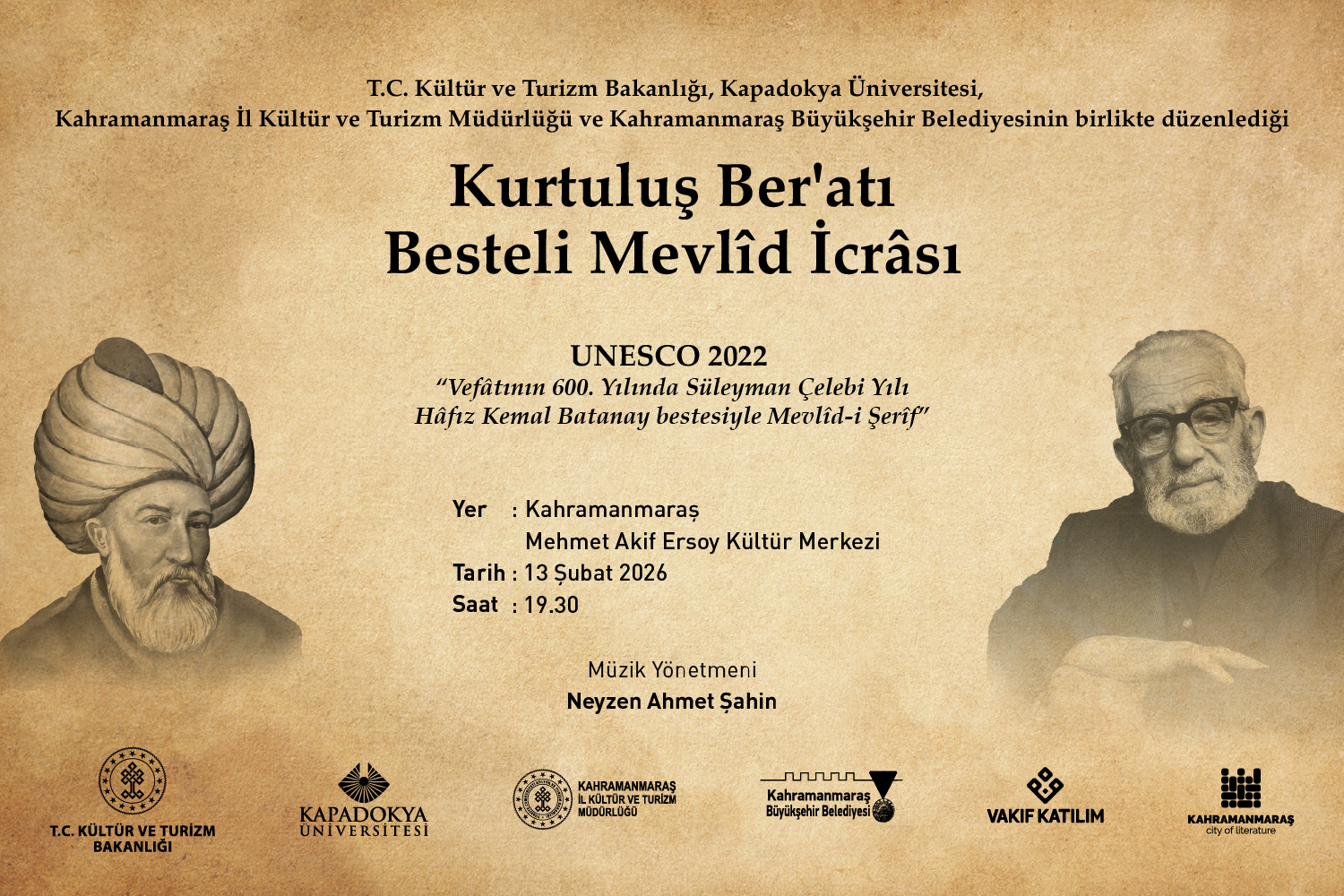 T.C. Kültür ve Turizm Bakanlığı desteğiyle, Kahramanmaraş İl Kültür ve Turizm Müdürlüğü, Kahramanmaraş Büyükşehir Belediyesi iş birliği ve Vakıf Katılım katkılarıyla düzenlenecek program, 13 Şubat 2026 Cuma günü saat 19.30’da Kahramanmaraş Mehmet Akif Ersoy Kültür Merkezi’nde izleyiciyle buluşacak.