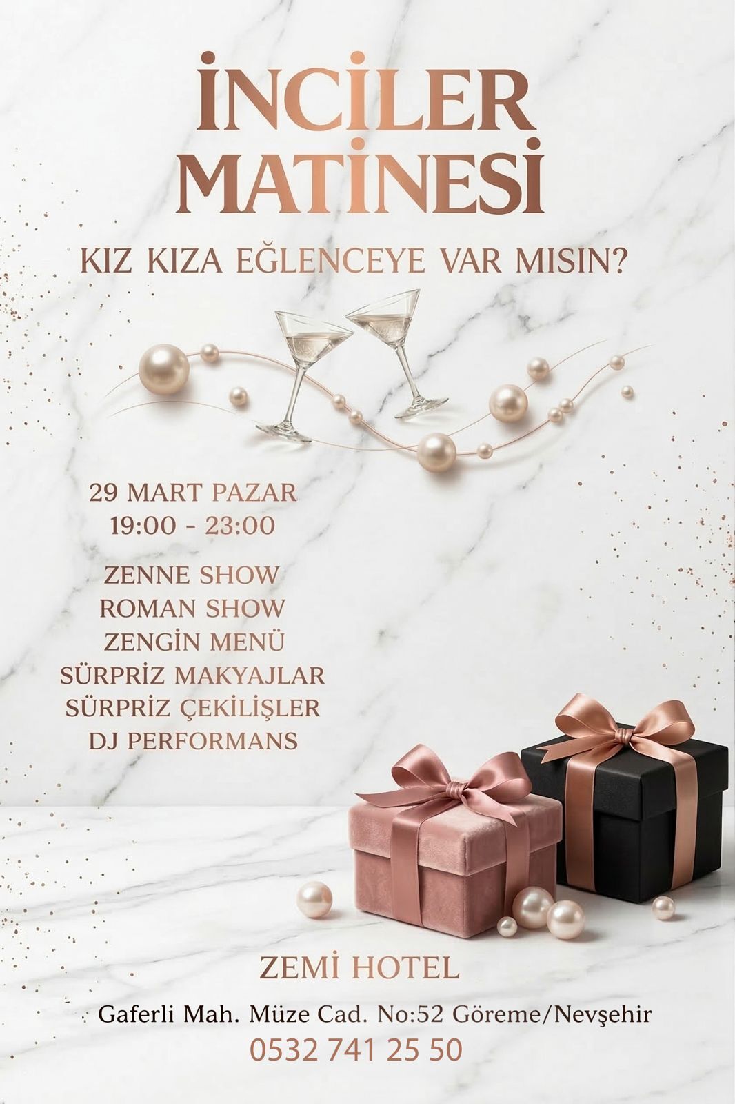 Kapadokya’nın gözde destinasyonlarından Göreme’de konumlanan Zemi Hotel, 29 Mart Pazar günü kadınlara özel olarak düzenlediği “İnciler Matinesi” ile eğlence dolu bir geceye imza atmaya hazırlanıyor. Saat 19:00 ile 23:00 arasında gerçekleşecek etkinlik, kadınlara özel konseptiyle hem sosyal hem de keyifli bir buluşma ortamı sunmayı hedefliyor.