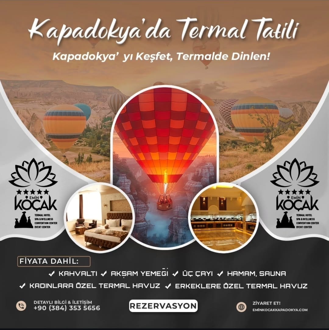 Kapadokya’nın doğal güzellikleri, kültürel mirası ve huzurlu ortamı Emin Koçak Termal Hotel’in sunduğu modern hizmetlerle birleşiyor. Misafirler ister sakin bir tatil, ister spor ve macera dolu bir deneyim yaşayabilir, ister sağlık turizmi ile termal ayrıcalıklardan faydalanabilir. Kapadokya’da hem dinlenin hem de şifa bulun.