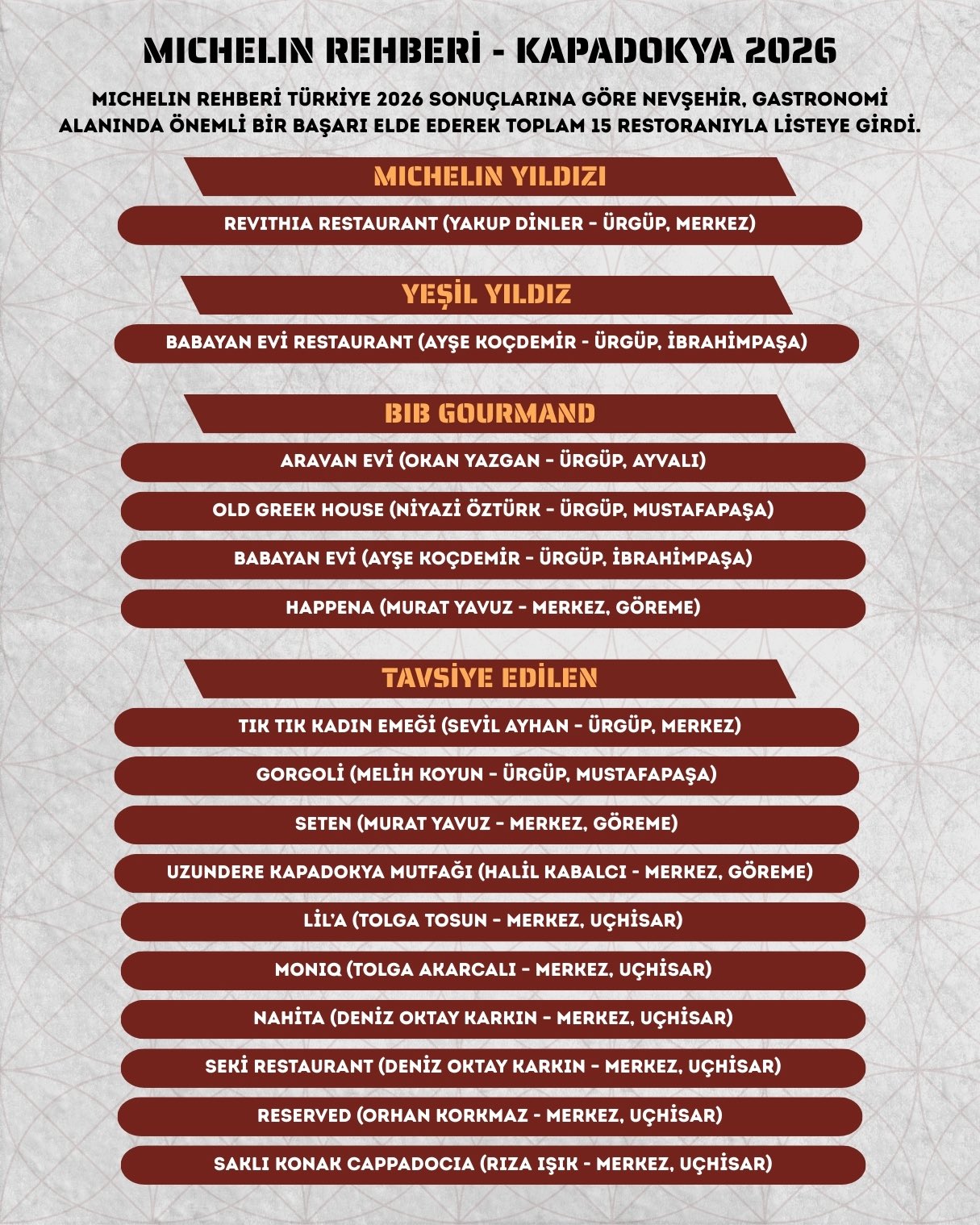 Nevşehir, MICHELIN Rehberi Türkiye 2026 sonuçlarına göre gastronomi alanında tarihi bir başarıya imza attı. Kapadokya Bölgesi’nden toplam 15 restoran, Michelin Rehberi’ne girerek Nevşehir’i Türkiye’nin en güçlü gastronomi destinasyonlarından biri hâline getirdi.