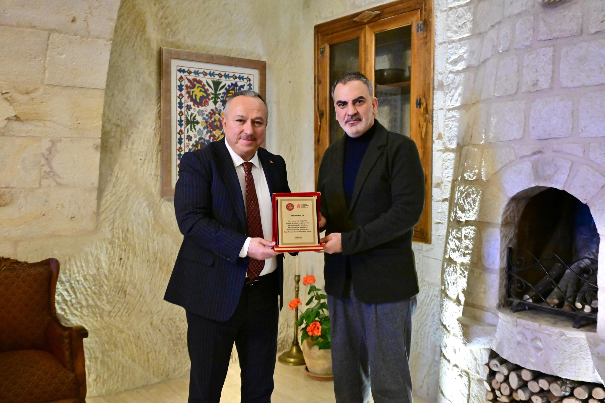 Vali Fidan, Nevşehir’de vergi rekortmenliği konusunda örnek bir başarı sergileyen ve bölge turizmine önemli katkılar sağlayan iş insanları Yakup Dinler ve Mehmet Dinler’e teşekkür plaketi takdim etti.