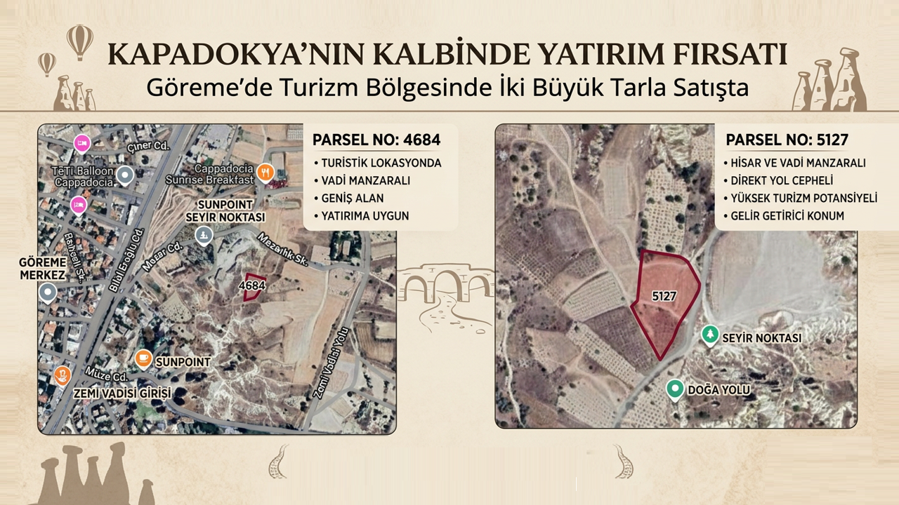 Göreme kasabasında satışa çıkarılan bu iki bağ vasfındaki tarla, hem konumları hem de turizm bölgelerine yakınlıkları nedeniyle yatırımcıların dikkatini çekiyor. Açık artırma tarihleri yaklaşırken taşınmazların yoğun ilgi görmesi bekleniyor.