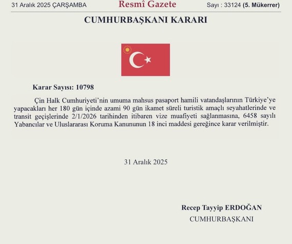 Resmi Gazete’de yayımlanan karara göre; Çin vatandaşları, 2 Ocak 2026 tarihinden itibaren Türkiye’ye yapacakları turistik seyahatlerde, her 180 gün içinde azami 90 gün süreyle vizeden muaf olacak. Söz konusu muafiyet aynı zamanda transit geçişleri de kapsıyor.