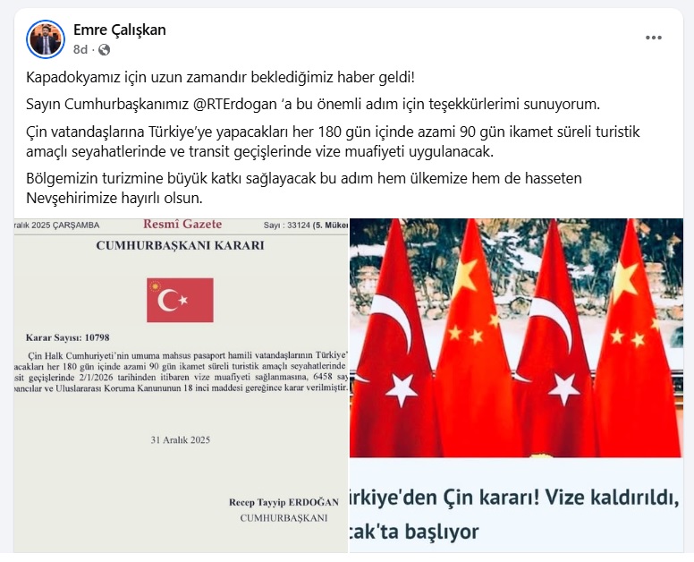 AK Parti Nevşehir Milletvekili Emre Çalışkan, Çin vatandaşlarına Türkiye’ye yönelik turistik seyahatlerde vize muafiyeti uygulanmasına ilişkin önemli gelişmeyi kamuoyuyla paylaştı. Uzun süredir beklenen kararın Resmi Gazete’de yayımlanarak resmiyet kazandığını belirten Çalışkan, özellikle Kapadokya Bölgesi ve Nevşehir turizmi açısından büyük bir kazanım elde edildiğini vurguladı.