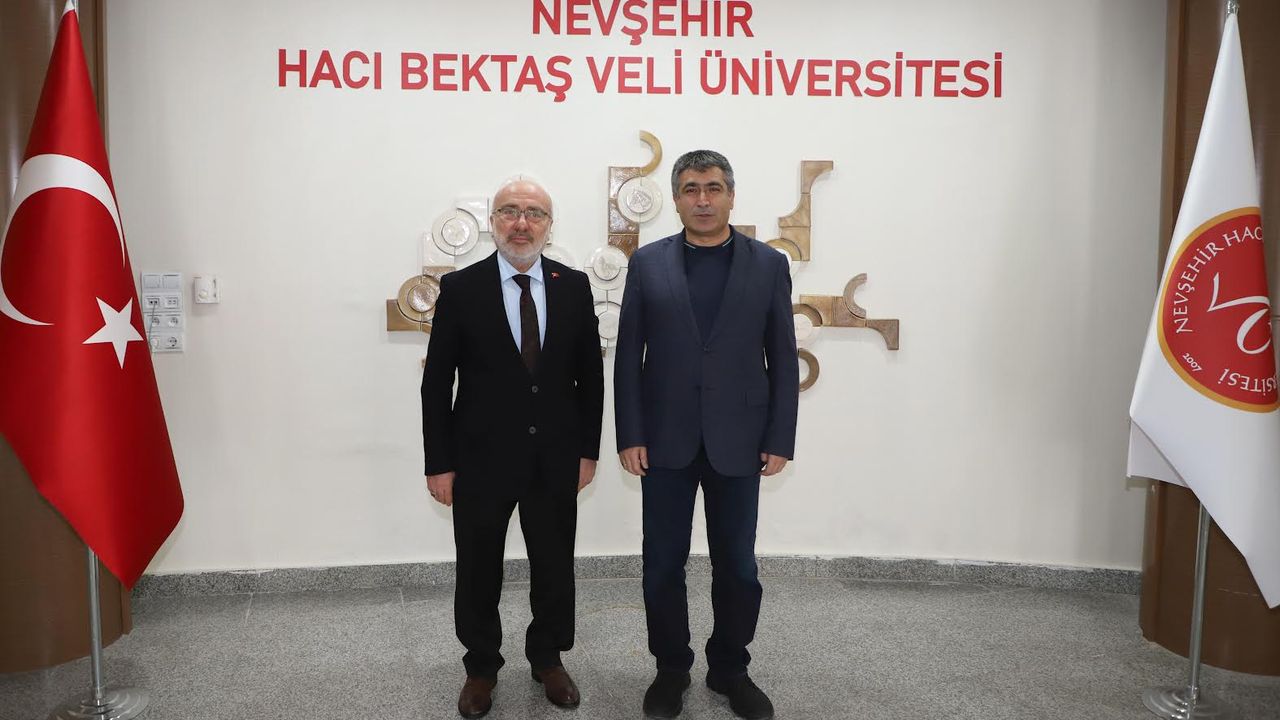 Kayseri Üniversitesi Rektörü Prof. Dr. Kurtuluş Karamustafa, Nevşehir Hacı Bektaş Veli Üniversitesi (NEVÜ) Rektörü Prof. Dr. Semih Aktekin’i makamında ziyaret etti.