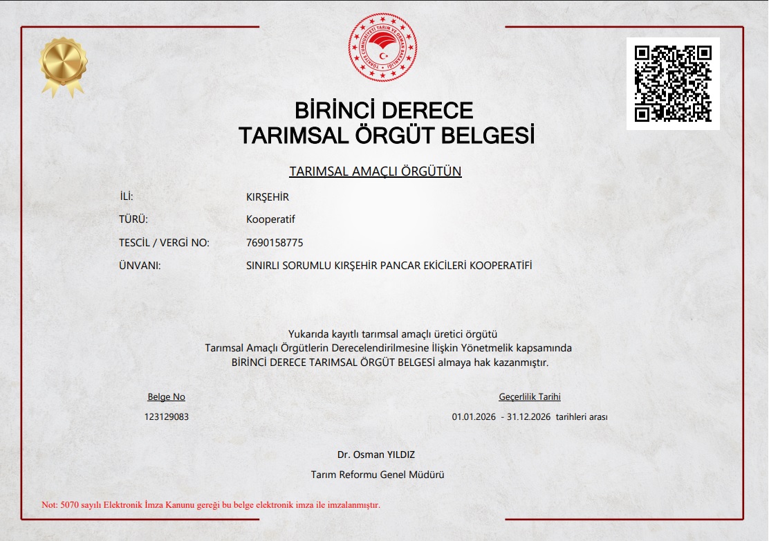 Belgede, Sınırlı Sorumlu Kırşehir Pancar Ekicileri Kooperatifi’nin, tarımsal amaçlı üretici örgütleri arasında birinci derece yeterliliğe sahip olduğu resmen tescillendi.