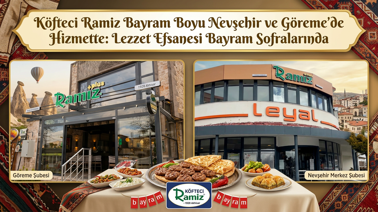 Yeni açılan Nevşehir şubesi ise LEYAL AVM üstünde hizmet veriyor. Gün boyu açık olan mekân, Ramiz’in efsane köftelerini ve zengin menüsünü şehir merkezinde de deneyimleme fırsatı sunuyor. Bayram boyunca hem Göreme hem Nevşehir şubeleri misafirlerini ağırlayacak.