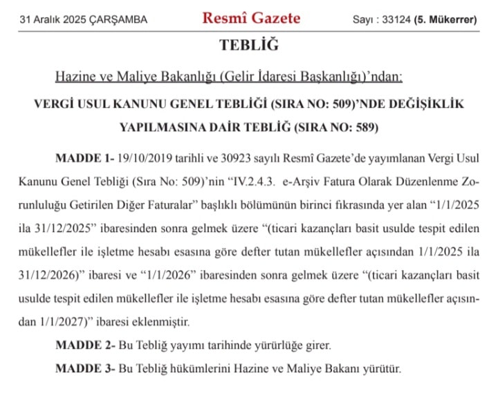 Hazine ve Maliye Bakanlığı tarafından hazırlanan Vergi Usul Kanunu Genel Tebliği’nde değişiklik yapan Tebliğ (Sıra No: 589), 31 Aralık 2025 tarihli Resmî Gazete’de yayımlanarak yürürlüğe girdi. Yapılan düzenleme ile e-Arşiv fatura uygulamasına geçiş süresi belirli mükellefler için bir yıl uzatıldı.