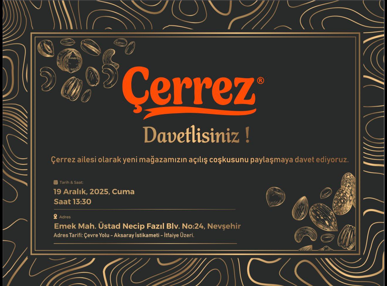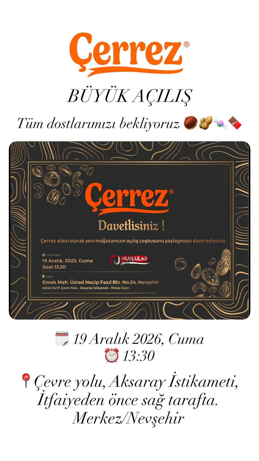 Çerrez ailesi, bu özel günde tüm dostlarını, lezzet tutkunlarını ve Nevşehir halkını büyük açılışa davet ediyor.