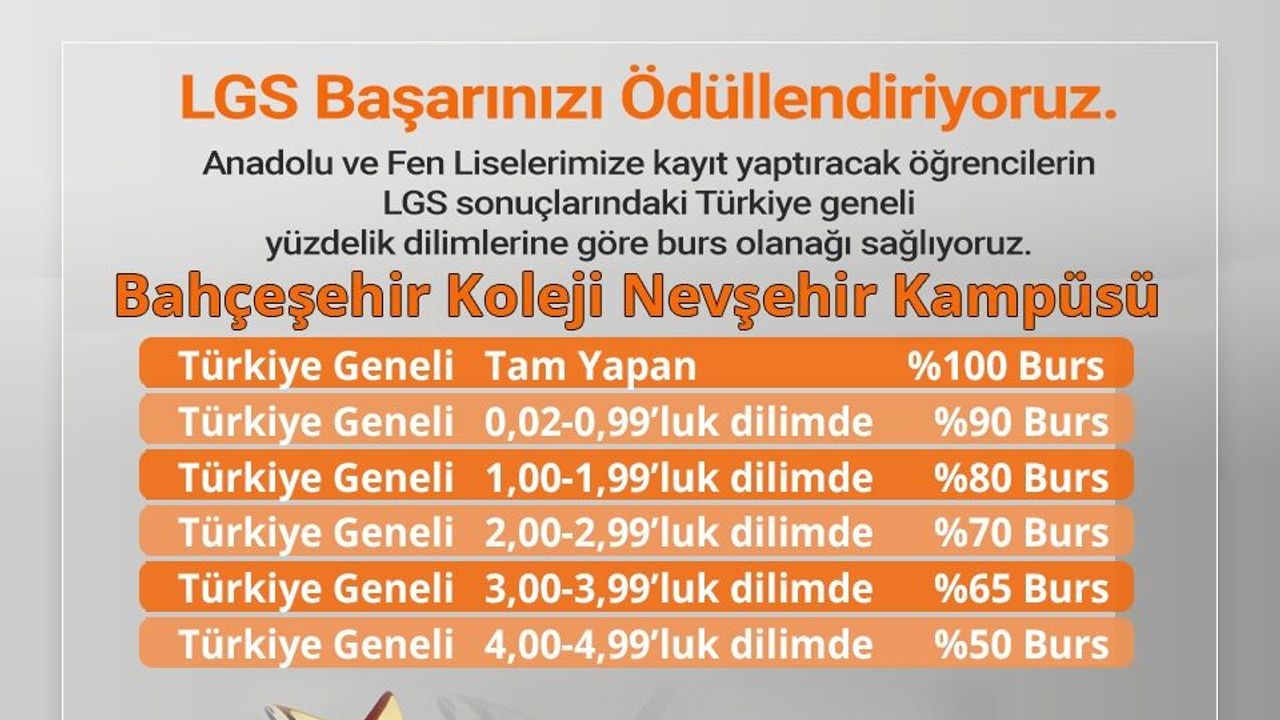 NEVŞEHİR BAHÇEŞEHİR KOLEJİ, LGS' de ilk % 20’lik dilime giren başarılı öğrencilere % 20’den %100’e kadar burs sağlıyor.