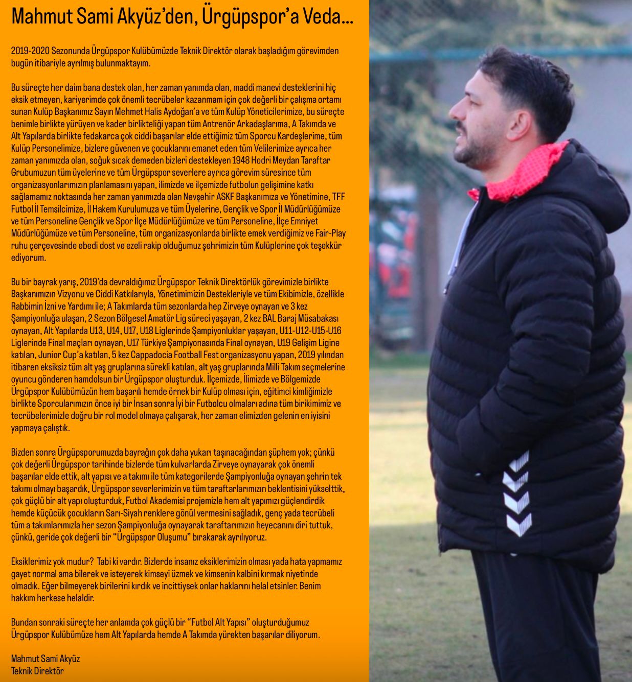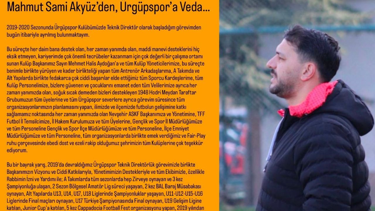 2019-2020 Sezonunda Ürgüpspor Kulübümüzde Teknik Direktör olarak başladığım görevimden bugün itibariyle ayrılmış bulunmaktayım.