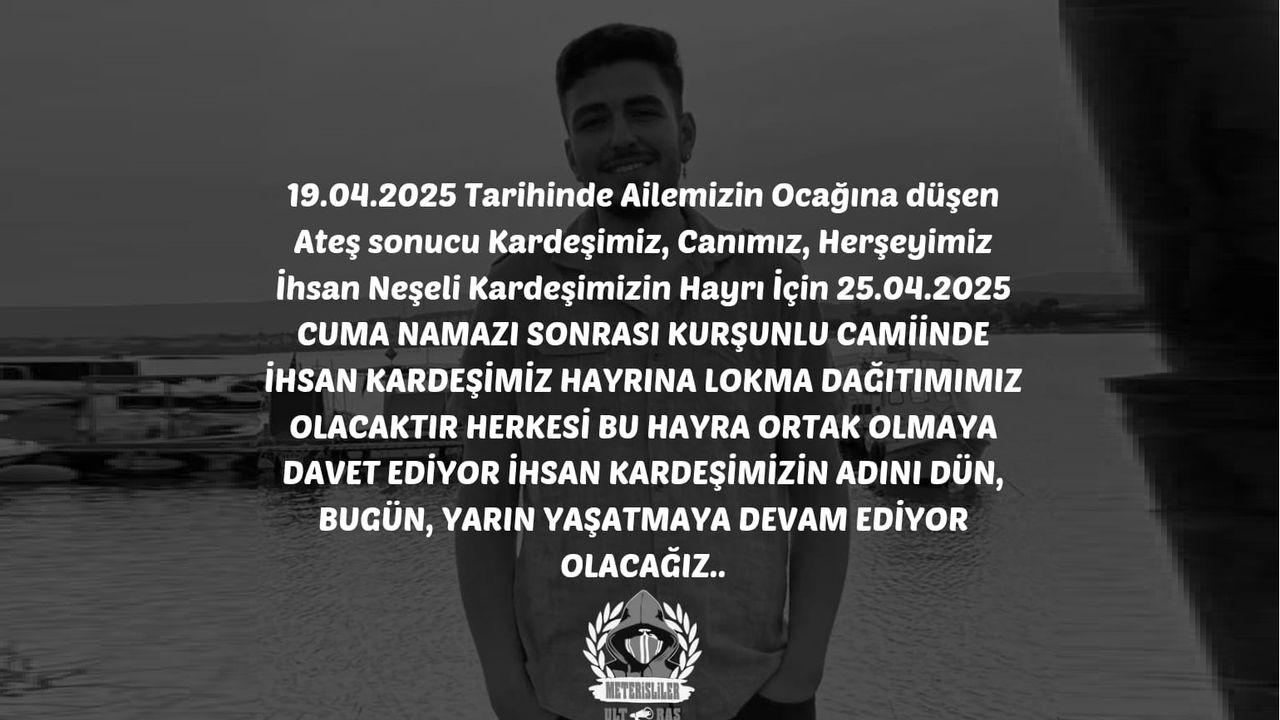 Meterisliler grubu adına Mustafa Şekerli yaptığı açıklamasında; "19.04.2025 Tarihinde Ailemizin Ocağına düşen Ateş sonucu Kardeşimiz, Canımız, Herşeyimiz İhsan Neşeli Kardeşimizin Hayrı İçin 25.04.2025 Cuma Namazı Sonrası Kurşunlu Camiinde İhsan Kardeşimiz Hayrına Lokma Dağıtımımız Olacaktır. Herkesi Bu Hayra Ortak Olmaya Davet Ediyor İhsan Kardeşimizin Adını Dün, Bugün, Yarın Yaşatmaya Devam Ediyor Olacağız..." dedi.