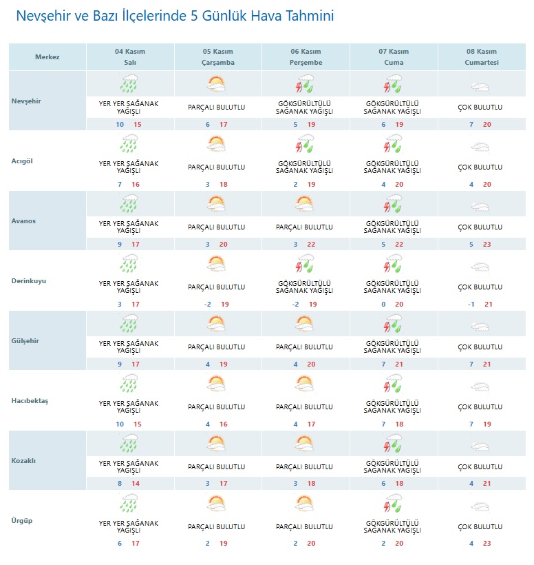 Meteoroloji 7. Bölge Müdürlüğü, Nevşehir ve ilçeleri için 5 günlük hava tahmin raporunu yayımladı. Yapılan açıklamaya göre, Nevşehir’de önümüzdeki günlerde yer yer sağanak ve gök gürültülü sağanak yağışlar etkili olacak. Hafta ortasından itibaren ise hava sıcaklıklarının kademeli olarak artacağı tahmin ediliyor.