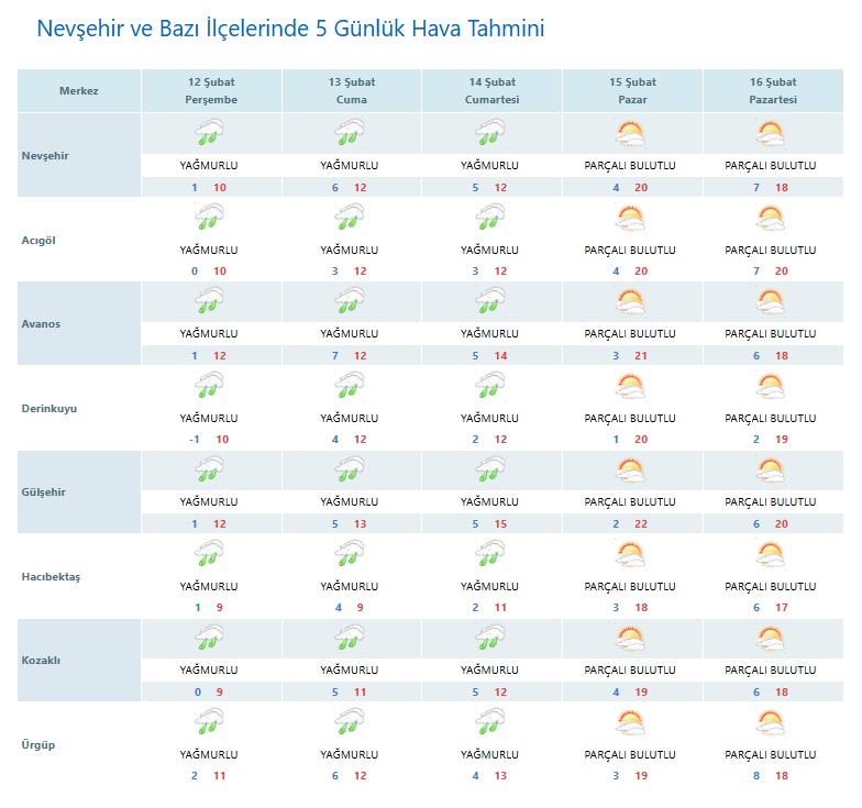 | Nevşehir | Yağmurlu | Yağmurlu | Yağmurlu | Parçalı Bulutlu | Parçalı Bulutlu |