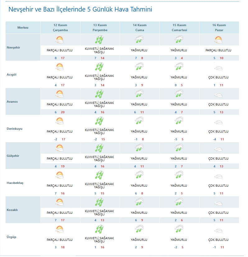 Meteoroloji 7. Bölge Müdürlüğü, Nevşehir ve ilçeleri için 12–16 Kasım 2025 tarihlerini kapsayan 5 günlük hava tahmin raporunu açıkladı. Rapora göre, kent genelinde çarşamba gününden itibaren kuvvetli sağanak yağışlar etkili olacak.