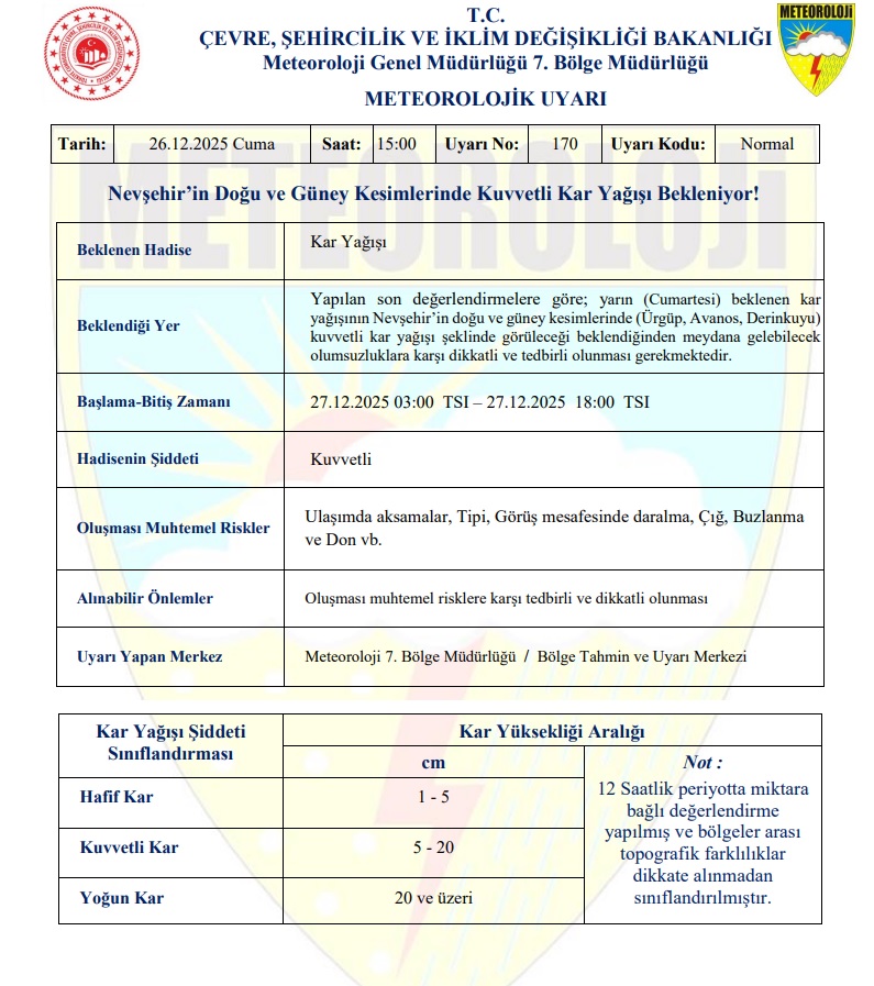 Meteoroloji 7. Bölge Müdürlüğü, Nevşehir’in doğu ve güney kesimlerinde 27 Aralık 2025 Cumartesi günü kuvvetli kar yağışı beklendiğini duyurdu. Yetkililer, özellikle Ürgüp, Avanos ve Derinkuyu ilçelerinde kar yağışının etkili olacağını belirterek vatandaşları tedbirli olmaları konusunda uyardı.