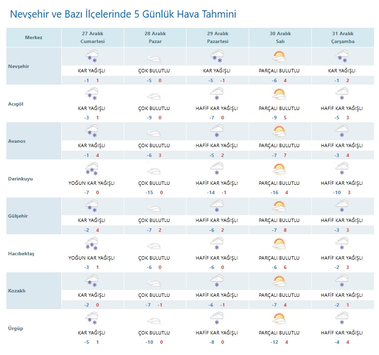 5 Günlük Hava Tahmini (Nevşehir ve İlçeleri)