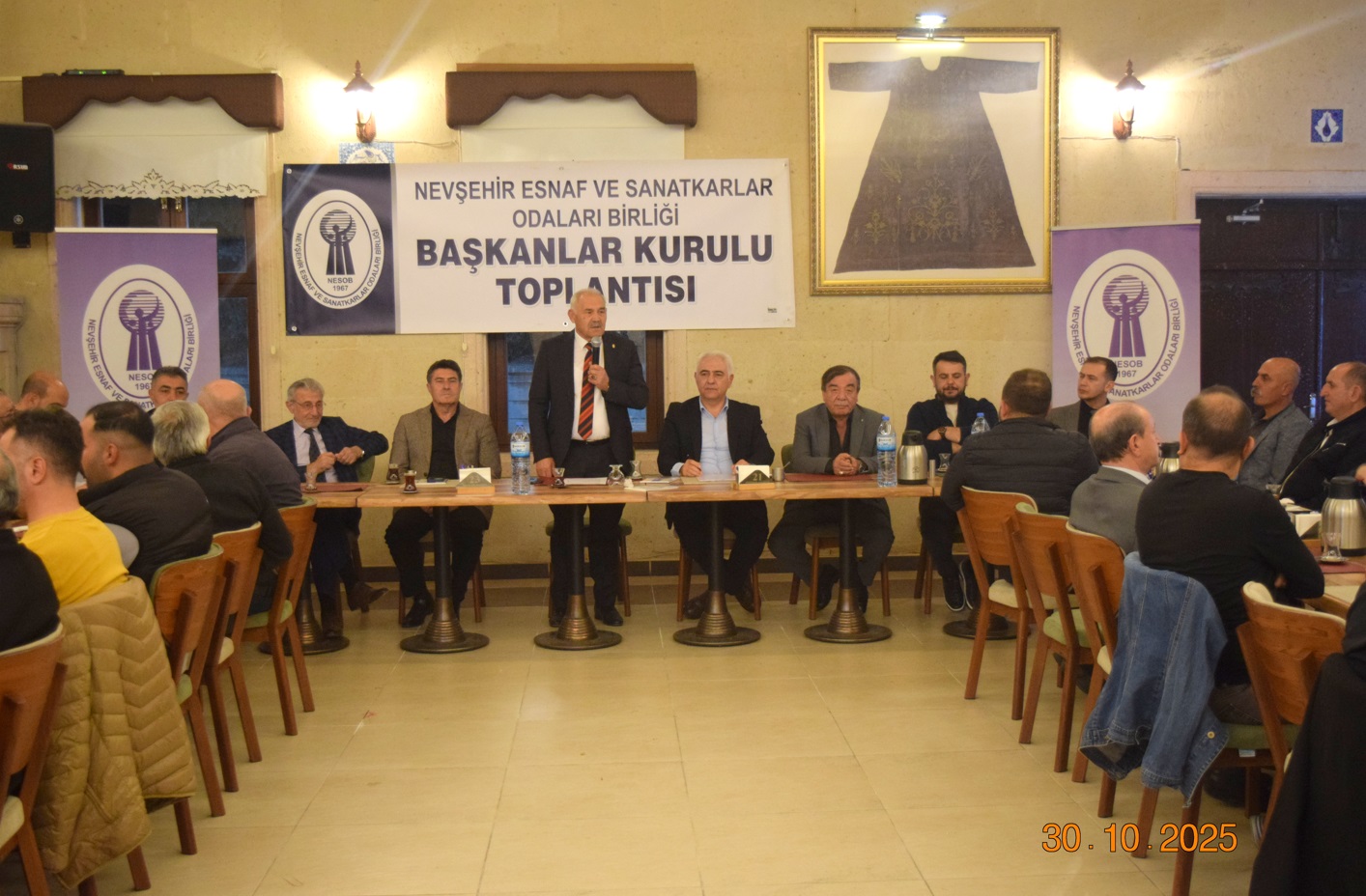 Nevşehir Esnaf ve Sanatkarlar Odaları Birliği 2025 yılı Başkanlar Kurulu Toplantısı 30 Ekim 2025 Perşembe günü Nevşehir Esnaf ve Sanatkarlar Odaları Birliği (NEVESOB) Başkanı Mehmet PINARBAŞI başkanlığında Nevşehir Ticaret İl Müdürü Ahmet Taygurt, Nevşehir Kredi Kefalet Kooperatifi Başkanı Erdoğan Korkutmaz ve NEVESOB’ a bağlı faaliyet gösteren 23 Oda Başkanı ve Oda Genel Sekreterlerinin katılımı ile Nevşehir Emniyet Müdürlüğü Topuzluhan Tesislerinde gerçekleştirildi.