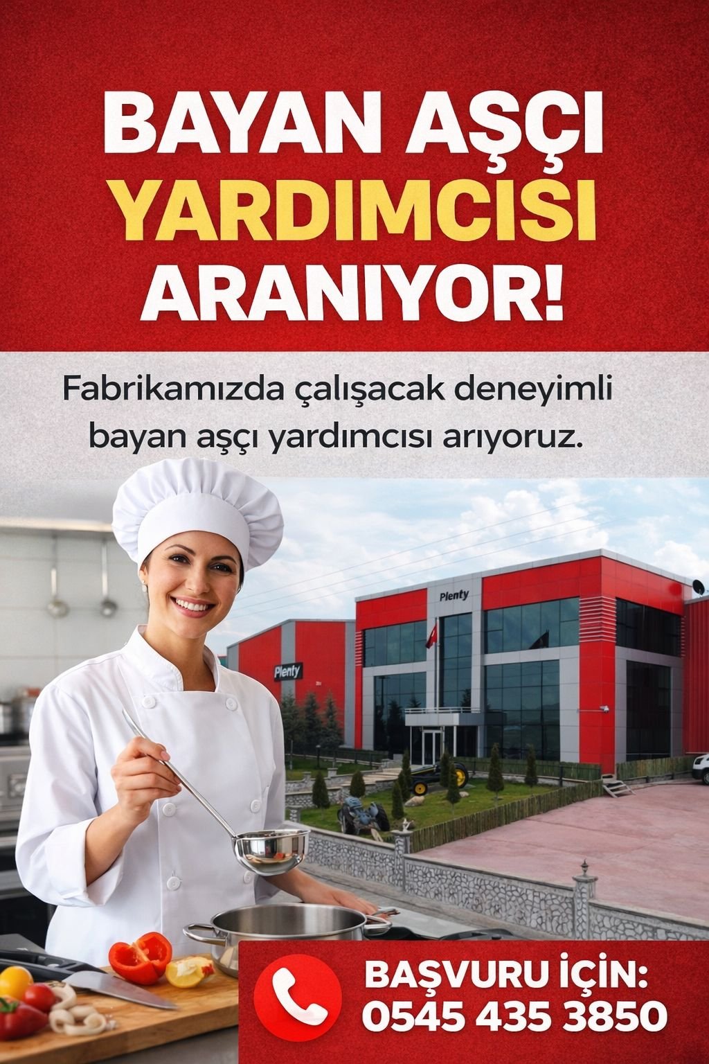 Nevşehir Acıgöl OSB’de faaliyet gösteren Plenty Kozmetik, mutfak ekibinde görevlendirilmek üzere hijyen kurallarına dikkat eden, takım çalışmasına yatkın bayan aşçı yardımcısı arıyor.