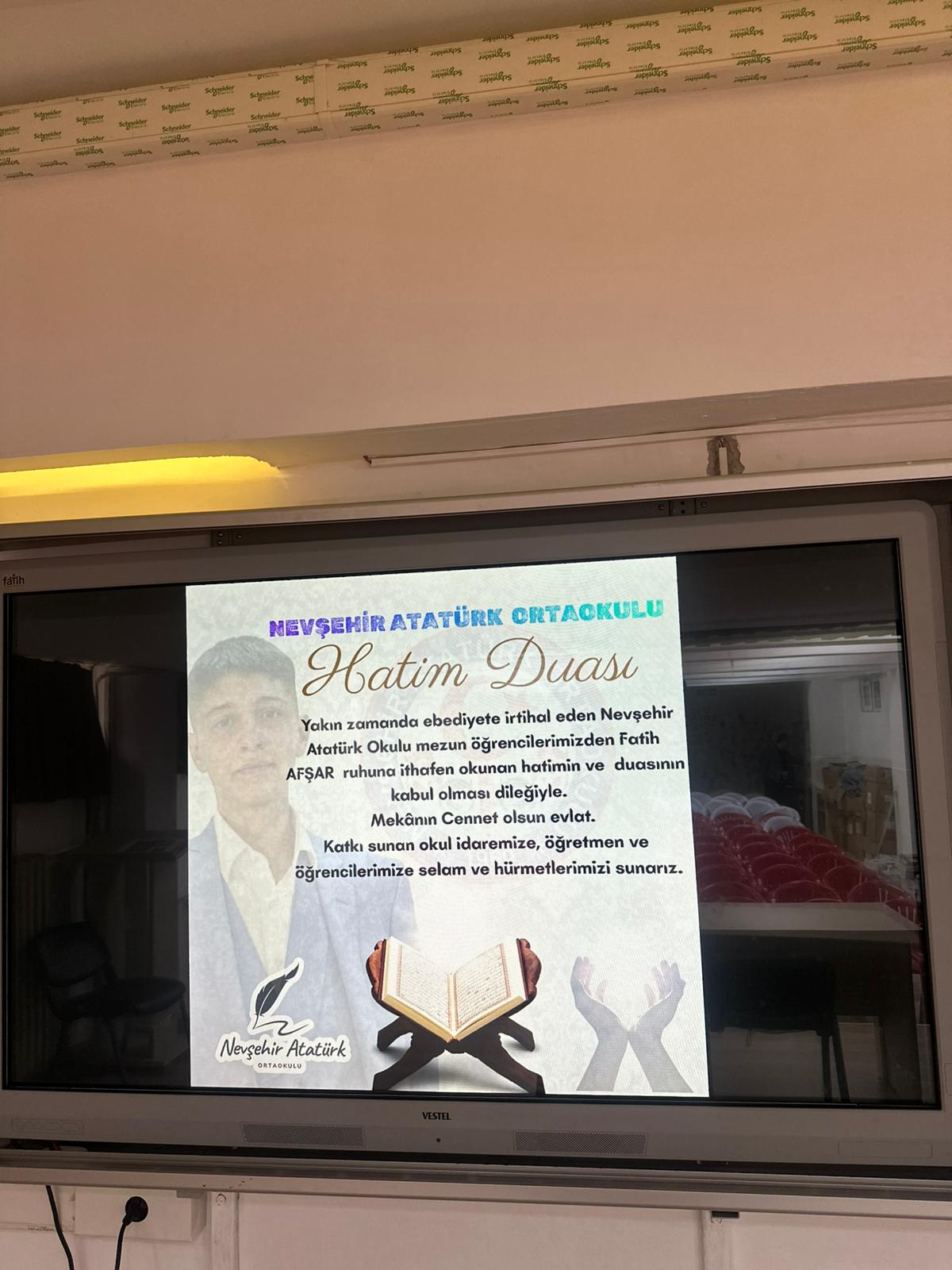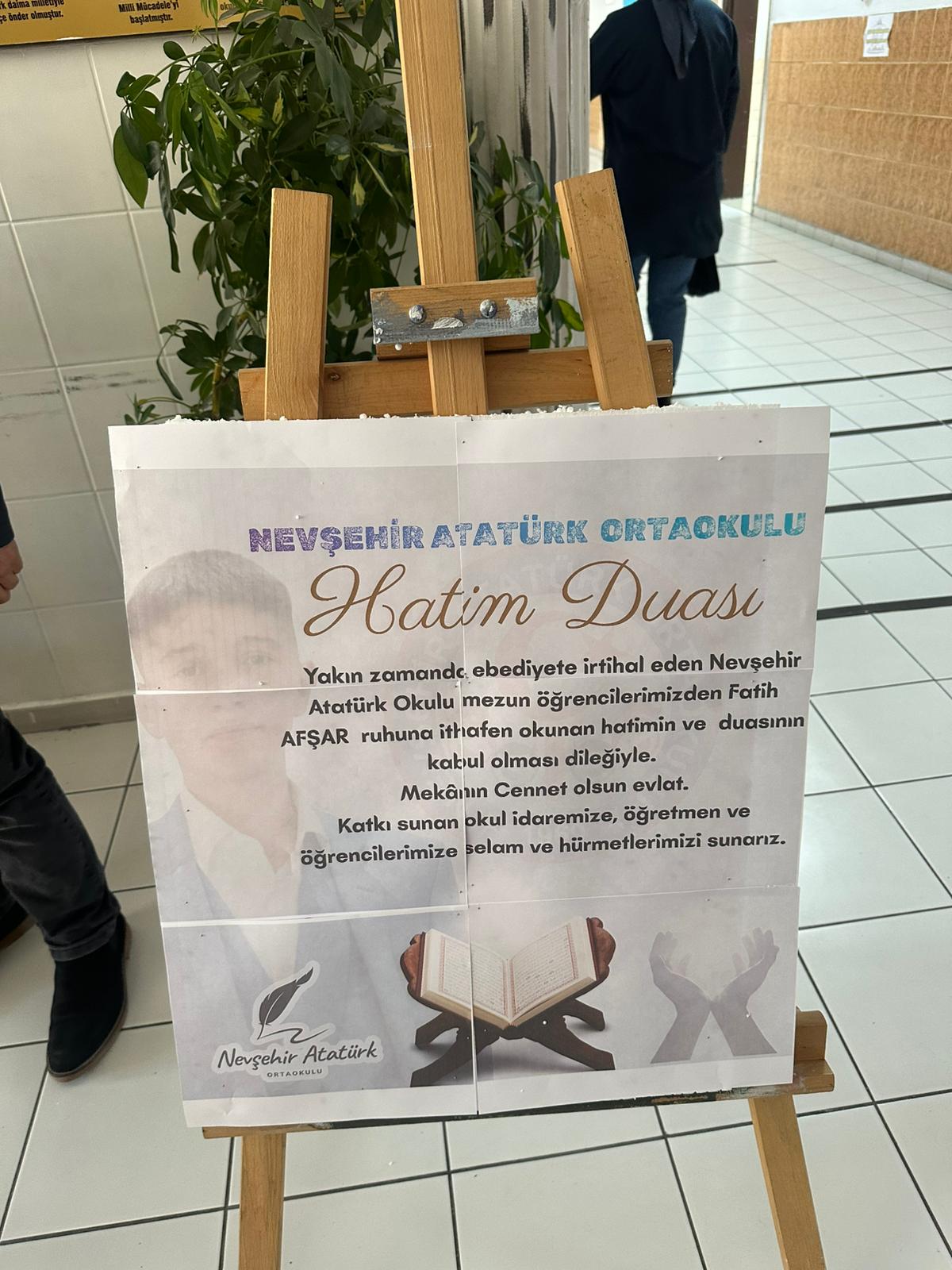 “Yakın zamanda ebediyete irtihal eden Nevşehir Atatürk Okulu mezun öğrencilerimizden Fatih Afşar ruhuna ithafen okunan hatimin ve duasının kabul olması dileğiyle… Mekânın Cennet olsun evlat. Katkı sunan okul idaremize, öğretmen ve öğrencilerimize selam ve hürmetlerimizi sunarız.”