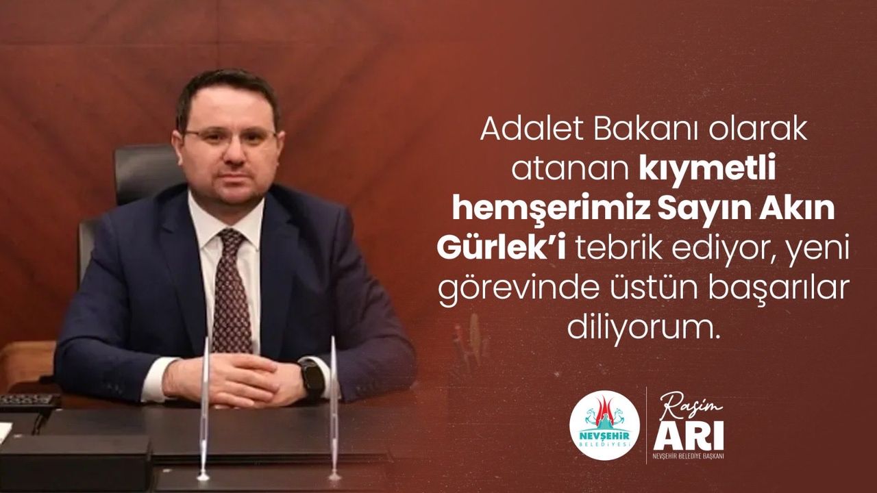 Nevşehir Belediye Başkanı Rasim Arı, Resmi Gazete’de yayımlanan Cumhurbaşkanı Kararı ile Adalet Bakanlığı görevine atanan Nevşehirli hemşehrimiz Akın Gürlek için bir tebrik mesajı yayımladı.