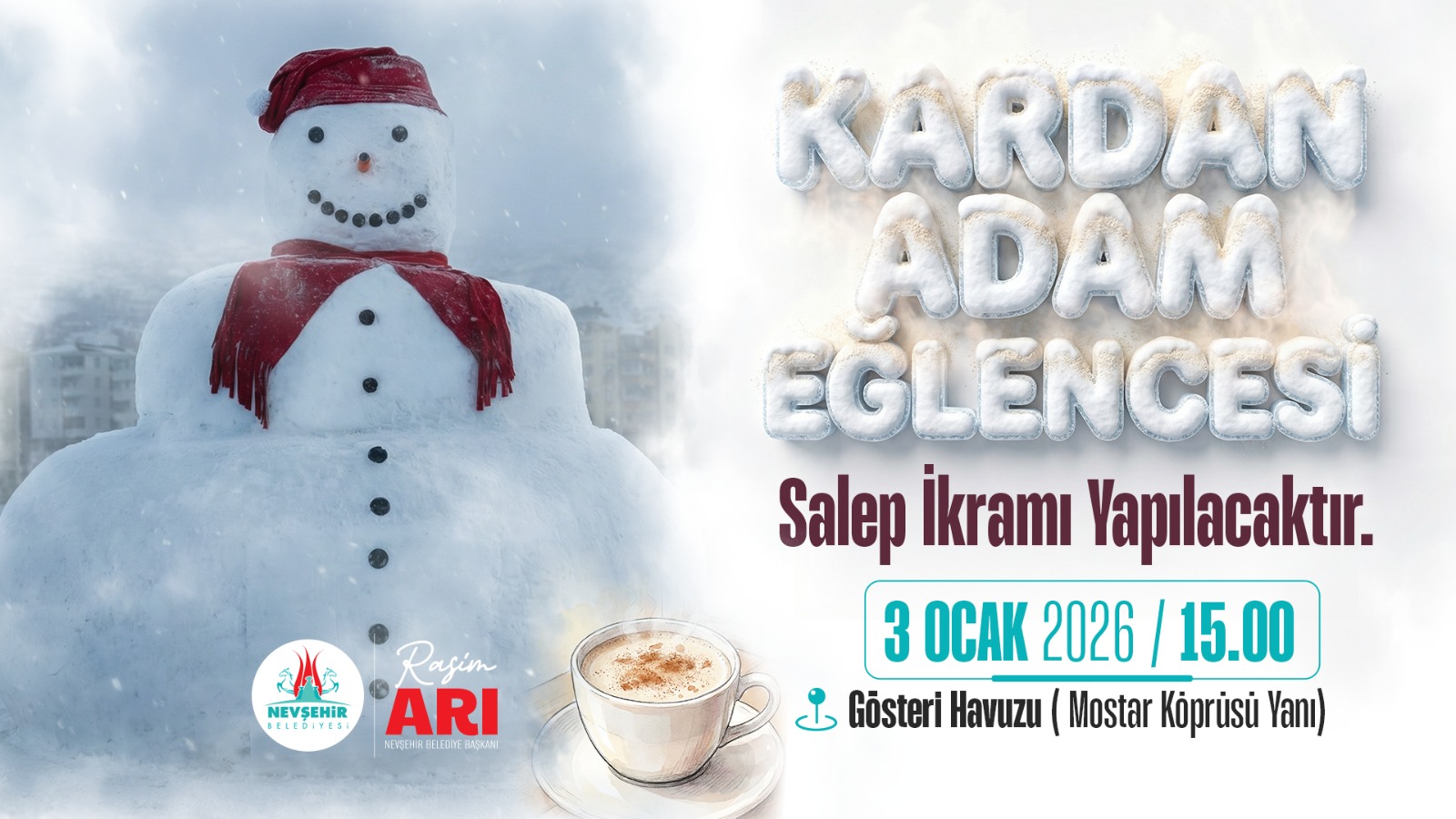 Raşitbey Mahallesi Mostar Köprüsü girişinde Kapadokya Gösteri Havuzu önünde düzenlenecek etkinlikte ailelerin çocuklarıyla birlikte katılıp kartopu oynayarak gönüllerince eğlenmeleri bekleniyor. Etkinliğe katılanlara Nevşehir Belediyesi ekipleri tarafından sıcak salep ikramı yapılacak.