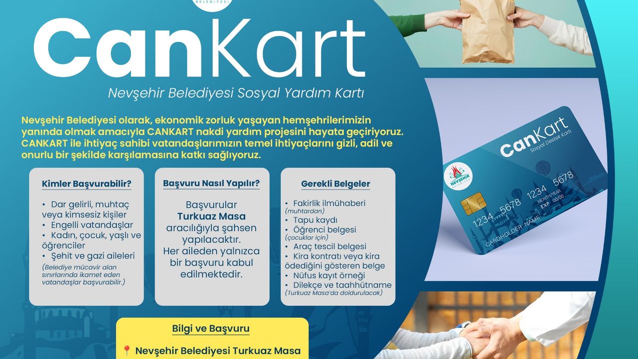 Sosyal Yardım Kartı CANKART kapsamında ihtiyaç sahibi olduğu tespit edilen ailelere nakdî destek sağlanacak. Belediye mücavir alan sınırları içerisinde ikamet eden ve yaşamını sürdürebilmek için ekonomik zorluk yaşayan, kendisinin veya bakmakla yükümlü olduğu kişilerin temel ihtiyaçlarını karşılayamayan dar gelirli, kimsesiz, engelli, kadın, çocuk, yaşlı, öğrenci, şehit ve gazi ailelerine Nevşehir Belediyesi bütçesinin imkanları dahilinde aile bütçelerine bir nebze de olsa katkıda bulunmak ve bu katkıyı gizli ve adil bir şekilde gerçekleştirmek amacı ile CANKART nakdi yardım projesini hayata geçirecek. Başvurular şahsen Turkuaz Masa aracılığıyla alınacak.