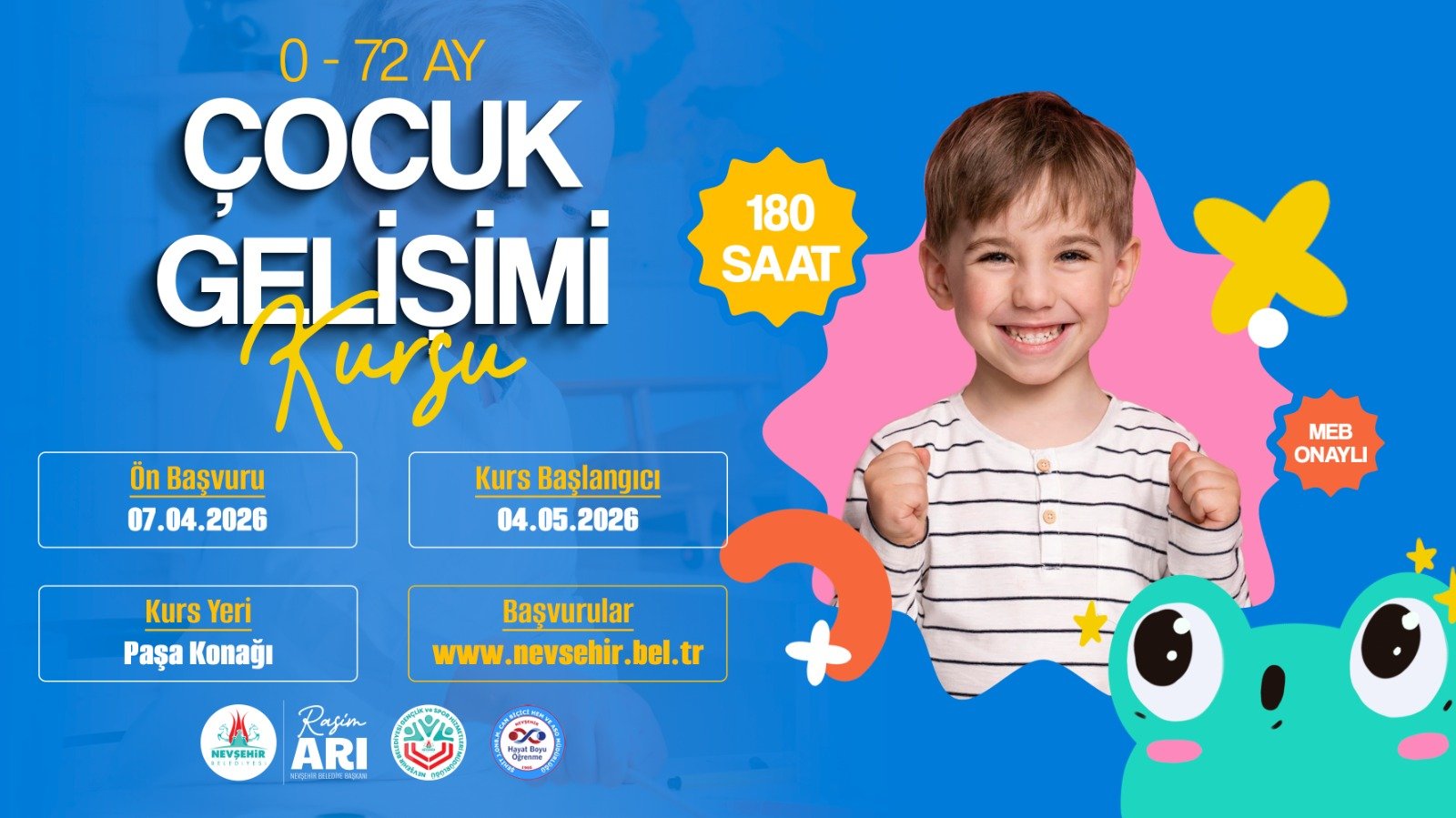 Nevşehir Belediyesi Gençlik ve Spor Hizmetleri Müdürlüğü bünyesinde faaliyetlerini sürdüren Kapadokya Eğitim Merkezi (KAPEM)’de 0-72 Ay Çocuk Gelişimi Kursu açılıyor. Nevşehir Belediyesi ve Nevşehir Şehit J. Onb. Muhammet Can Biçici Halk Eğitimi Merkezi iş birliğince alanında uzman eğitmen kadrosuyla düzenlenen kurslar ve eğitimler sayesinde her yaş grubundan binlerce kişiye Milli Eğitim Bakanlığı (MEB) onaylı sertifikalı eğitim imkânı sunan Kapadokya Eğitim Merkezi’nde planlanan “Çocuk Gelişim Kursu” kayıtları 07 Nisan 2026 Salı günü (bugün) başlıyor.