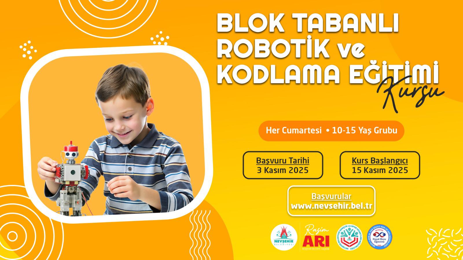 10-15 yaş arası Çocuklar İçin Blok Tabanlı Robotik ve Kodlama Eğitimi Kursu; 03 Kasım 2025 tarihinde alınmaya başlayacak olan başvurular sonrası kurs 15 Kasım 2025 tarihinde başlayıp 14 Mart 2026 tarihinde tamamlanacak. Kurs Cumartesi günleri 09.00 - 13.00 saatleri arasında yapılacak.