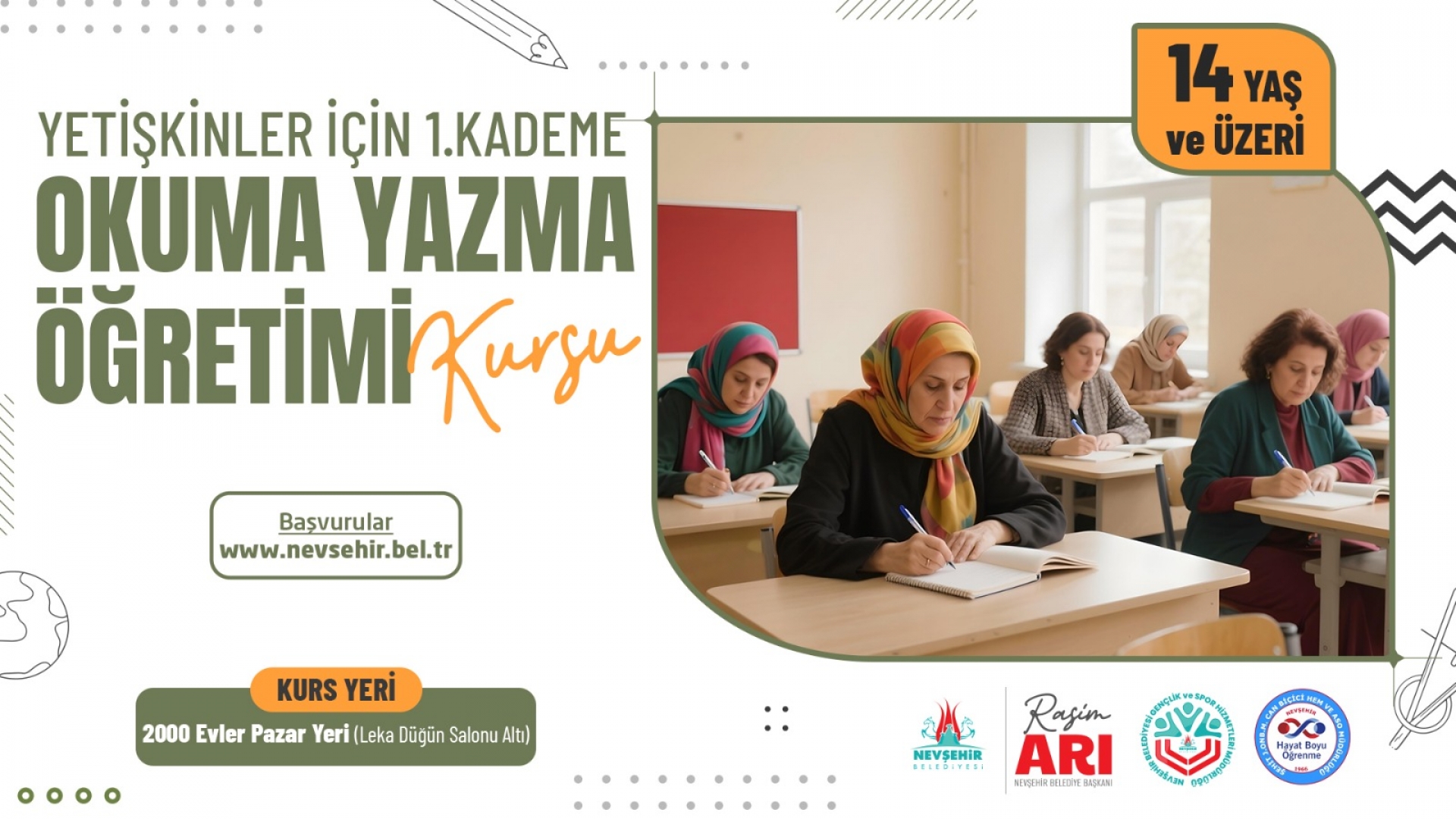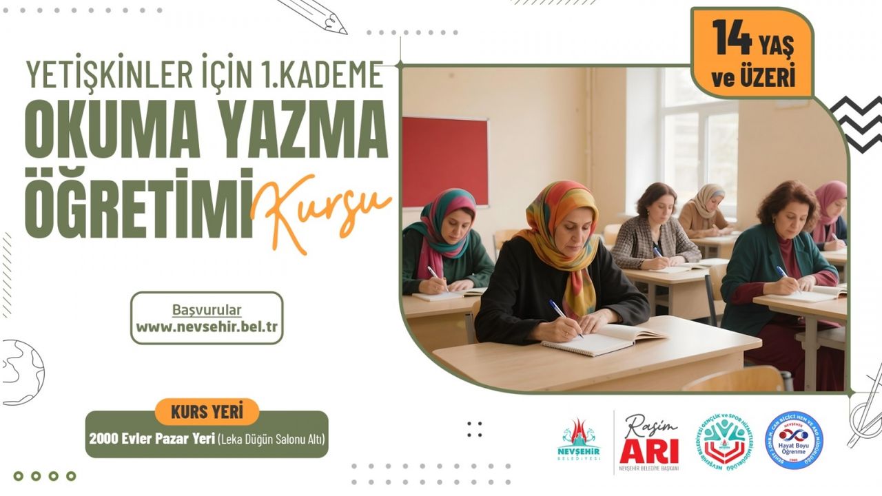 Nevşehir Belediyesi www.nevsehir.bel.tr web sitesi üzerinden yapılacak olan kurs başvuruları 12 Kasım 2025 tarihi itibariyle başlarken Yetişkinler İçin 1. Kademe Okuma Yazma Öğretimi Kursu 2000 Evler Pazar yerinde (Leka Düğün Salonu Altı) 02 Aralık 2025 – 04 Mart 2026 tarihleri arasında yapılacak.