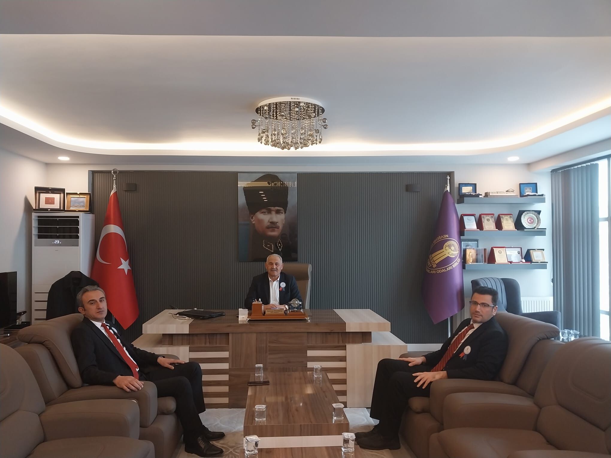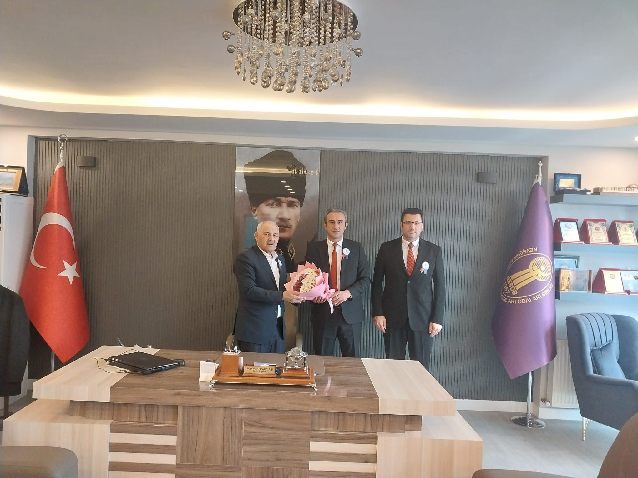 Vergi Haftası etkinlikleri kapsamında Nevşehir Defterdarı Sezer Sarı, beraberinde Personel Müdürü Ayhan Mert ile birlikte Nevşehir Esnaf ve Sanatkarlar Odaları Birliği (NEVESOB) Başkanı Mehmet Pınarbaşı’yı makamında ziyaret etti.