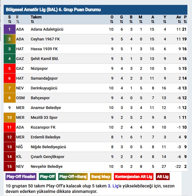 BAL 6. Grup Güncel Puan Durumu (10. Hafta Sonu)