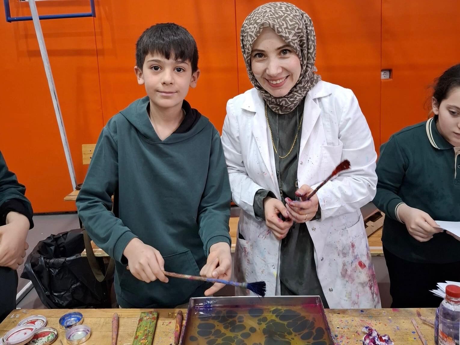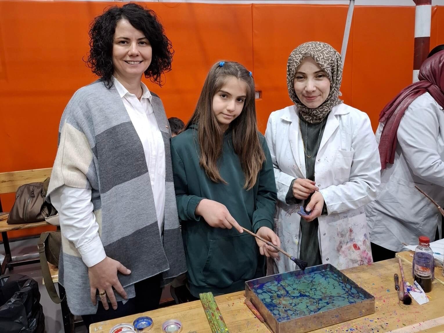Programın bir diğer bölümünde ise ebru sanatçıları tarafından gerçekleştirilen çalışmalar büyük ilgi gördü. Öğrenciler, ebru sanatının tekniklerini öğrenerek kendi ebru çalışmalarını yapma fırsatı buldu. Renklerin su üzerindeki uyumunu deneyimleyen öğrenciler, geleneksel Türk sanatlarından biri olan ebruya yakından tanıklık etti.