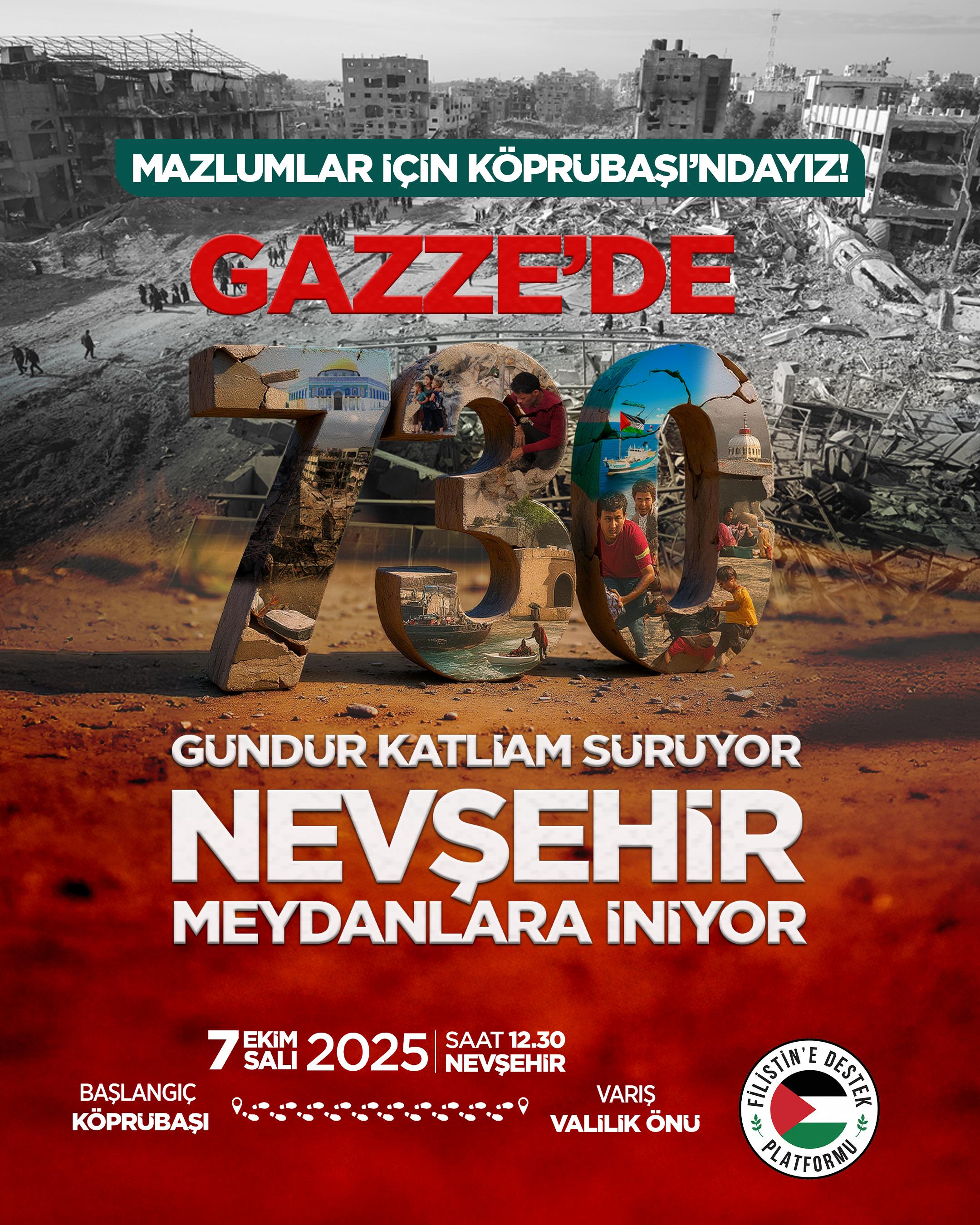 Etkinlik, Köprübaşı’ndan başlayıp Valilik önü’nde sona erecek şekilde planlandı. Platform yetkilileri, katılımcıları bu anlamlı yürüyüşe davet ederek, “Gazze’de 730 gündür devam eden katliama sessiz kalmayacağız. Nevşehir halkını mazlumlar için meydanlara çağırıyoruz” mesajını verdi.