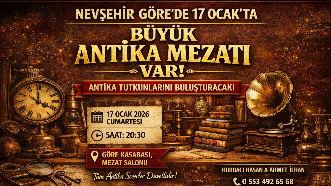Nevşehir’in Göre beldesinde, antika meraklılarını bir araya getirecek Antika Mezatı için geri sayım başladı. Bölgenin kültürel ve sanatsal yaşamına renk katacak olan mezat, 17 Ocak 2026 Cumartesi günü saat 20.30’da Göre Kasabası’nda, Net BİMS karşısında bulunan Mezat Salonu’nda gerçekleştirilecek.