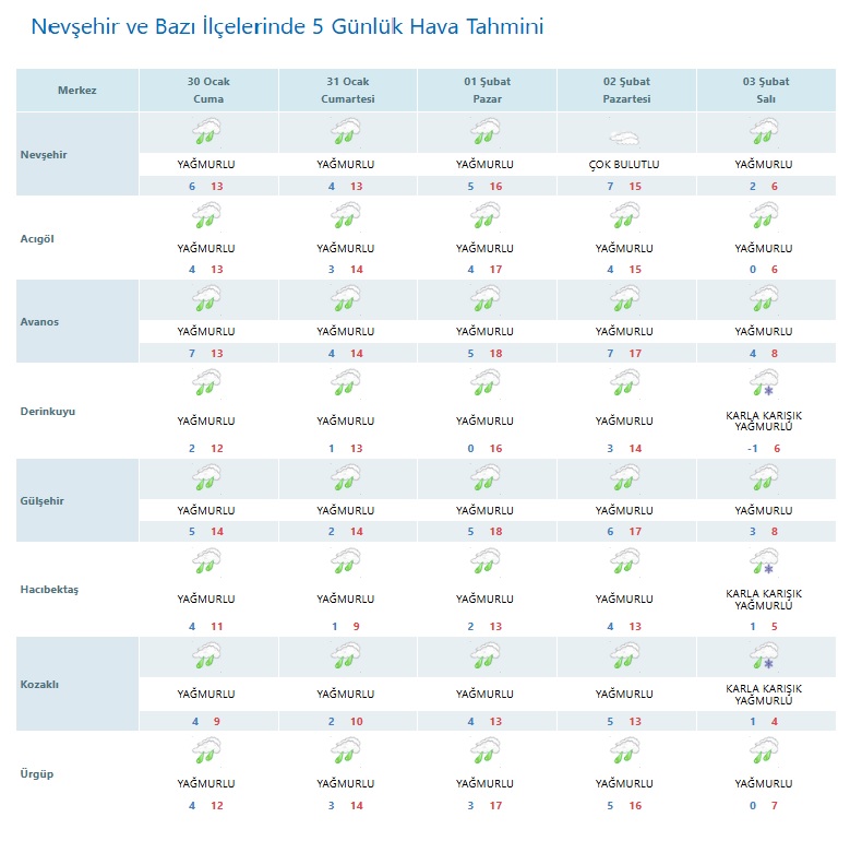Meteoroloji Genel Müdürlüğü verilerine göre, Nevşehir ve ilçelerinde önümüzdeki 5 gün boyunca yağışlı hava etkili olacak. Özellikle hafta sonu yağmurun aralıklarla devam etmesi, pazartesi gününden itibaren ise bazı ilçelerde karla karışık yağmur görülmesi bekleniyor.