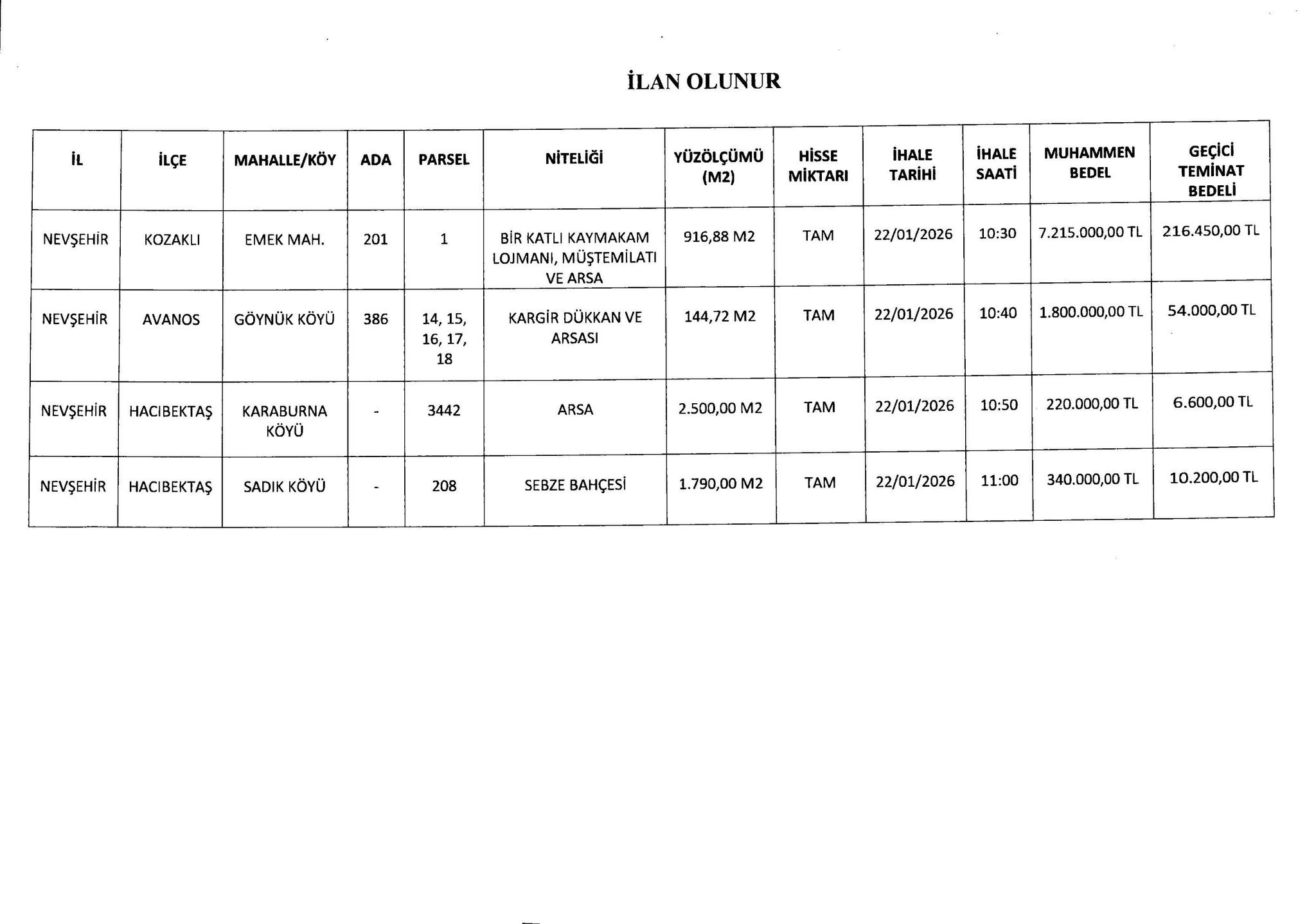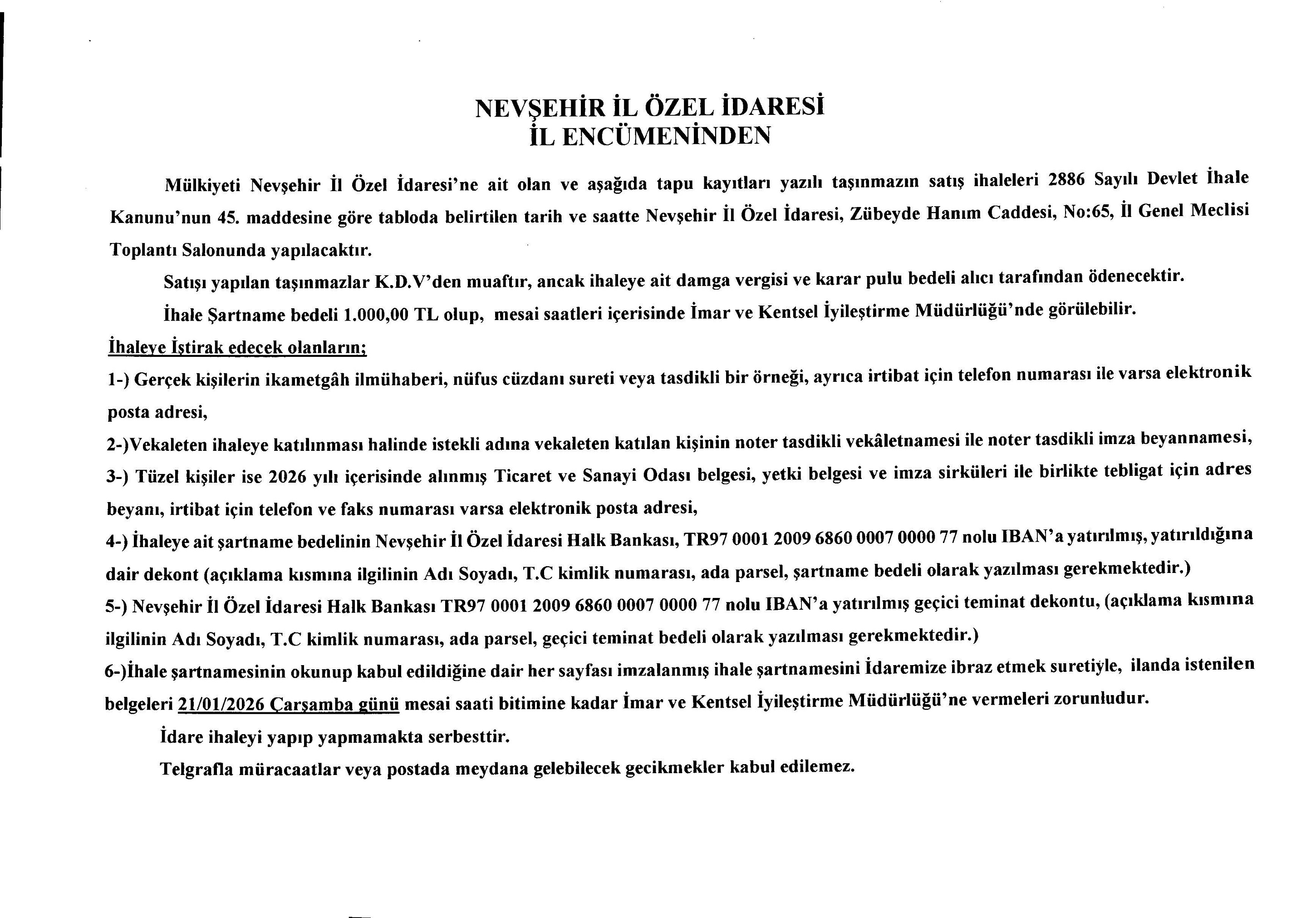 Nevşehir İl Özel İdaresi mülkiyetinde bulunan çeşitli taşınmazlar, 2886 sayılı Devlet İhale Kanunu’nun 45. maddesi kapsamında açık teklif usulü ile satışa çıkarılıyor. Satış ihaleleri, Nevşehir İl Özel İdaresi İl Encümeni tarafından gerçekleştirilecek.