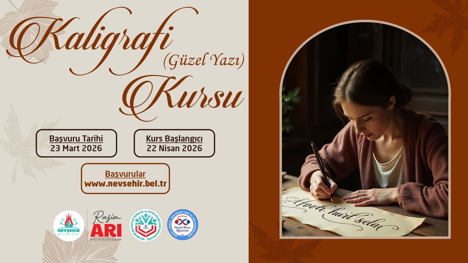 Kaligrafi (Güzel Yazı) Kursu; 23 Mart 2026 Pazartesi gününden itibaren alınmaya başlanan başvurular sonrası kurs 22 Nisan 2026 tarihinde başlayıp 09 Eylül 2026 tarihinde tamamlanacak. Kurs Çarşamba ve Perşembe günleri 10.00 - 15.00 saatleri arasında yapılacak.