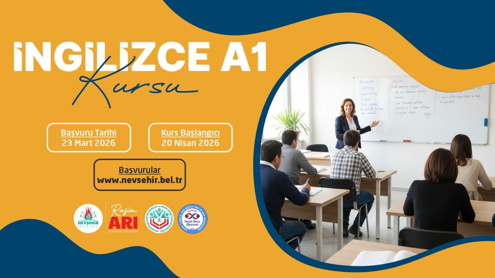 İngilizce A1 Seviyesi Kursu; 23 Mart 2026 Pazartesi gününden itibaren alınmaya başlanan başvurular sonrası kurs 20 Nisan 2026 tarihinde başlayıp 02 Temmuz 2026 tarihinde tamamlanacak. Kurs Pazartesi, Salı, Çarşamba ve Perşembe günleri 17.00 - 20.00 saatleri arasında yapılacak.