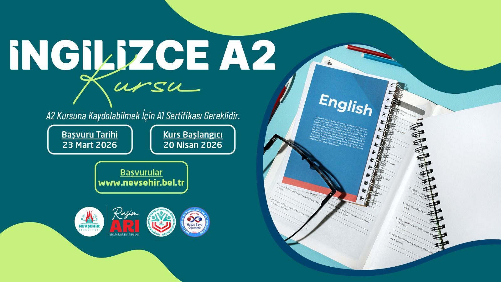 İngilizce A2 Seviyesi Kursu; 23 Mart 2026 Pazartesi gününden itibaren alınmaya başlanan başvurular sonrası kurs 20 Nisan 2026 tarihinde başlayıp 18 Haziran 2026 tarihinde tamamlanacak. Kurs Pazartesi, Salı, Çarşamba ve Perşembe günleri 09.00 - 13.00 saatleri arasında yapılacak.
