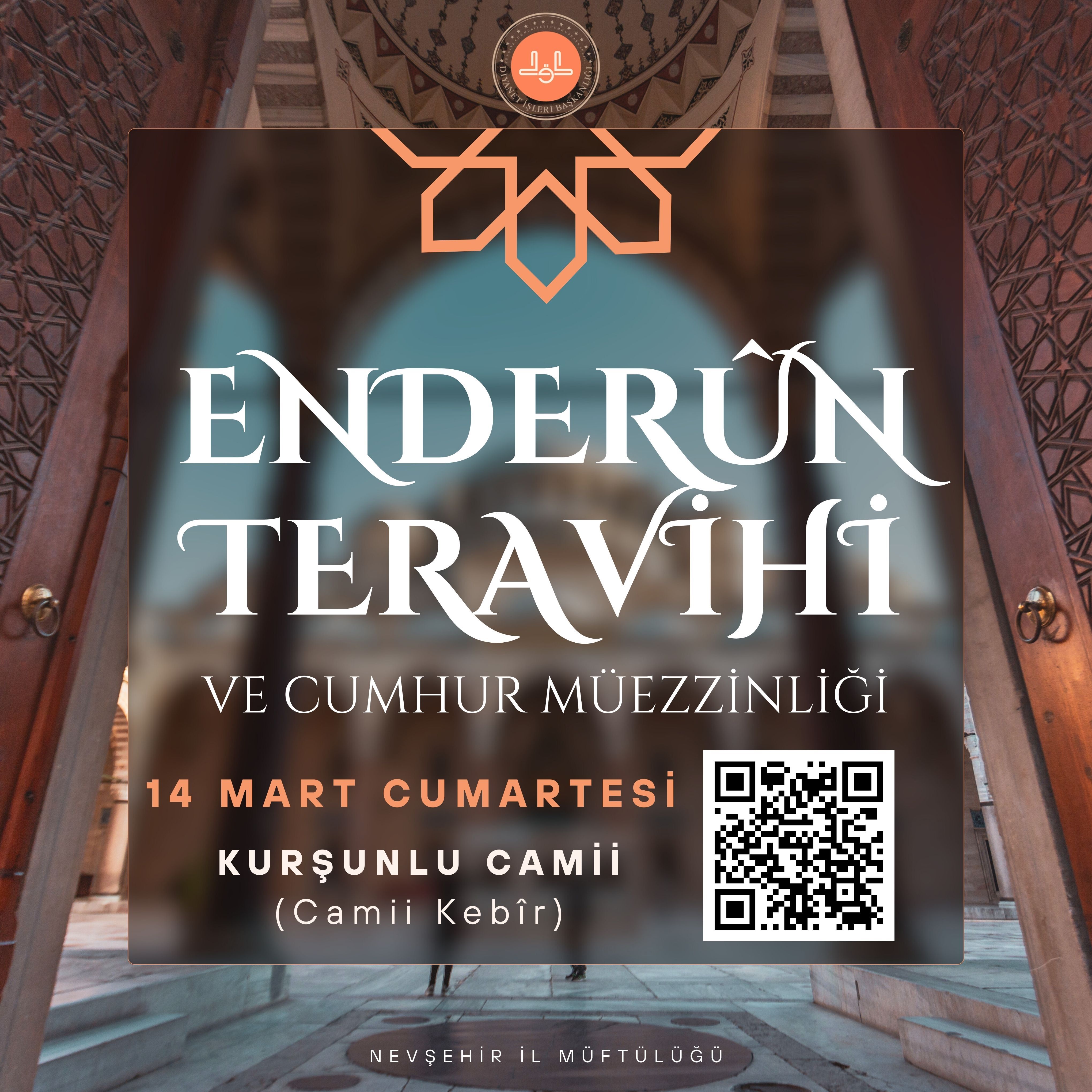 Nevşehir Müftülüğü, 2026 Ramazan Programı kapsamında ilimiz ve ilçelerimizde özel olarak yaşatılmaya çalışılan Enderûn Usulü Teravih ve Cumhur Müezzinliği uygulamasını 14 Mart Cumartesi günü Tarihi Kurşunlu Camii’nde gerçekleştirecek.