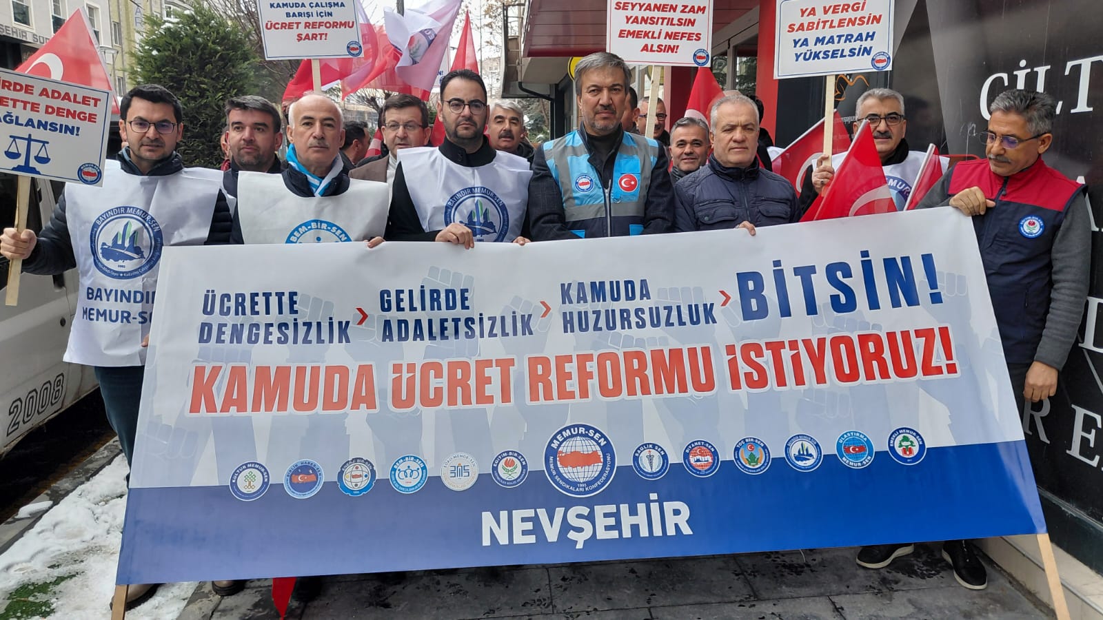 Memur-Sen Nevşehir Şube Başkanı Harun Öcal, 15 Ocak 2026 tarihinde sendikanın hizmet binası önünde basın açıklaması yaparak kamu görevlilerinin yaşadığı ücret dengesizliği ve gelir adaletsizliğine dikkat çekti. Türkiye genelinde 81 ilde eş zamanlı düzenlenen basın açıklamalarının, 2026 yılının ilk maaş gününe denk gelecek şekilde özellikle seçildiği vurgulandı.