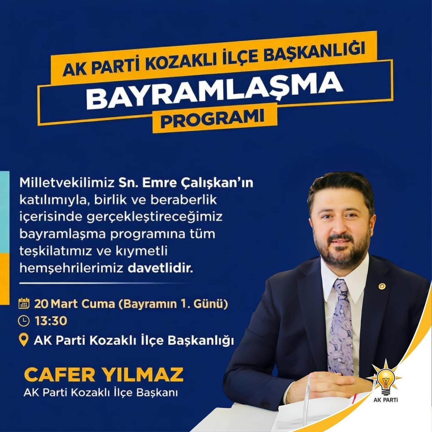 AK Parti Nevşehir Milletvekili Emre Çalışkan, Ramazan Bayramı dolayısıyla bir mesaj yayımlayarak hemşehrilerinin bayramını kutladı ve bayramlaşma programını duyurdu.