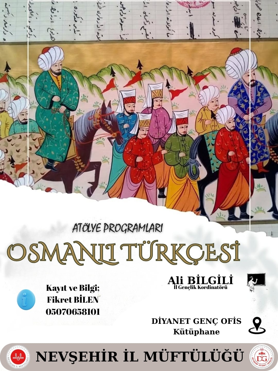 Nevşehir İl Müftülüğü, gençlere yönelik Osmanlı Türkçesi Atölye Programı düzenliyor. Program, Diyanet Genç Ofis Kütüphanesi bünyesinde gerçekleştirilecek ve katılımcılara Osmanlı Türkçesini öğrenme fırsatı sunacak.