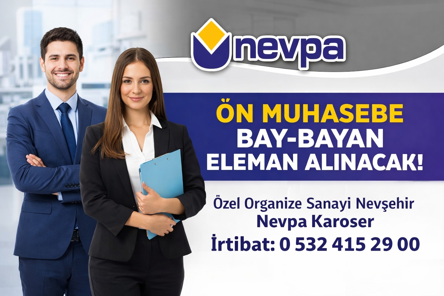 Nevşehir Organize Sanayi Bölgesinde karoser ve treyler ekipmanları sektöründe faaliyet gösteren NEVPA firmasında, Ön muhasebe elemanı olarak çalışacak Bay Bayan eleman alınacaktır.