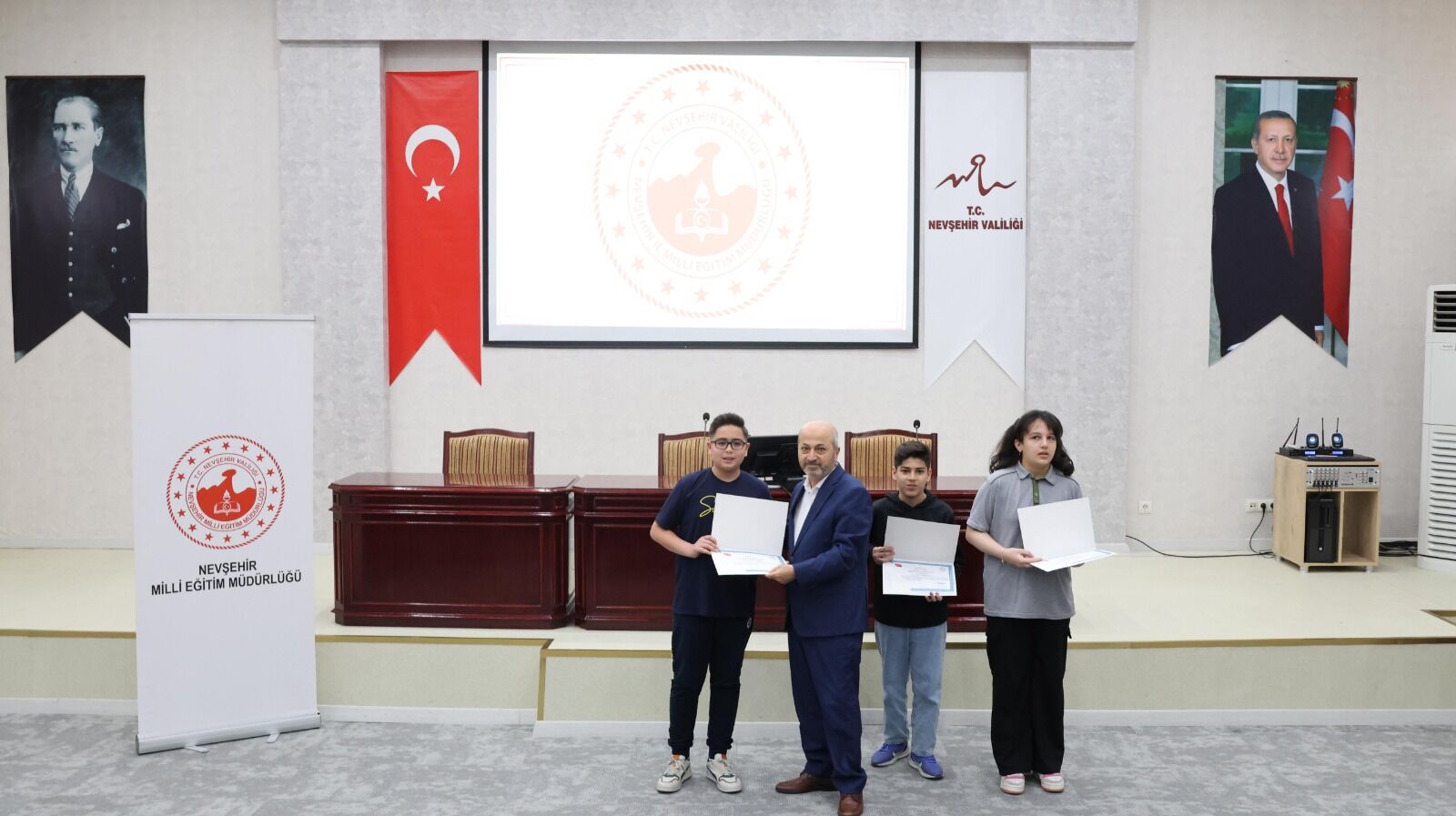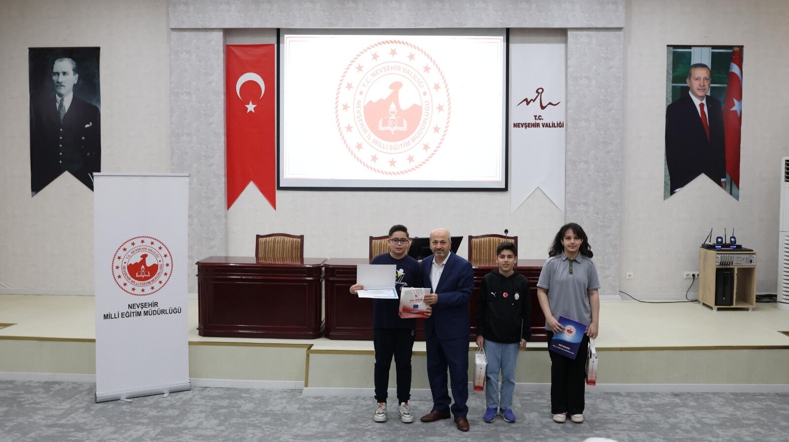 Dereceye giren öğrenciler için Nevşehir Valiliği Toplantı Salonu'nda özel bir ödül töreni düzenlendi. Tören etkinliğinde hazır bulunan başarılı öğrenci Zeki Çakabey Erdoğan, ödülünü İl Milli Eğitim Müdürü Sayın Yusuf Yazıcı ve Şube Müdürü Sayın Yücel Irmak'ın elinden aldı.