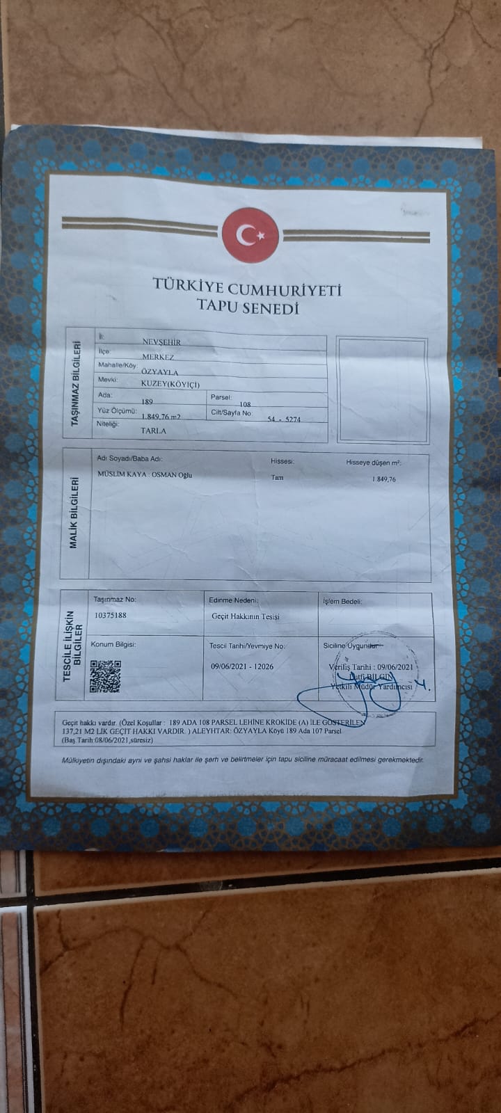 Konum: Nevşehir (Merkez) — Özyayla Köyü, 189 Ada, 108 Parsel